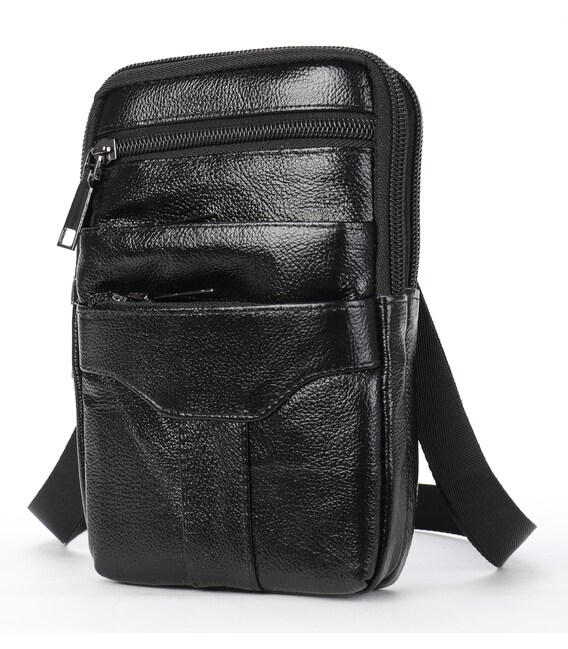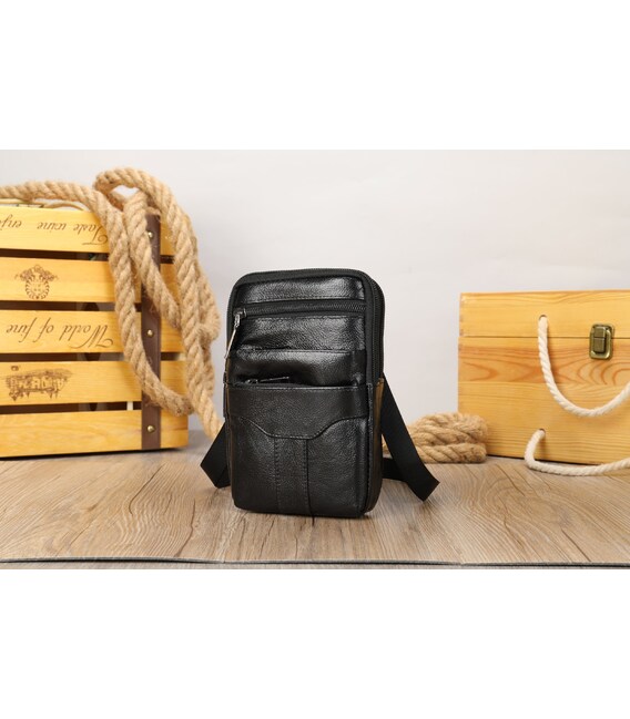Цвет: черный; Материал: натуральная кожа высокого качества; Размер (ШхВхГ, см): 11,5х18,5х4. Страна производитель: Китай. Внутри: - два основных отделения на молнии; - два накладных кармана на молниях на лицевой стороне; - один встроенный карман на молнии лицевой стороне аксессуара; - карабин на тыльной стороне; - съемный текстильный ремешок. Компактная кожаная сумка, которая с легкостью сможет заменить вам барсетку. Особенностью сумки является то, что вы можете носить ее, повесив на свой ремень в соответствующую петельку на тыльной стороне или зацепить ее с помощью карабина. С такой сумочкой все личные вещи будут у вас под рукой и перед глазами. Сумка, которая крепится на пояс обеспечит безопасность всем вашим личным вещам и освободит руки. Модель дополнена крепкой металлической фурнитурой. Сумка будет находкой для водителей, таксистов и мужчин, которые проводят много времени за рулем. А также для практичных мужчин. Аксессуар упакован в пылезащитный чехол.