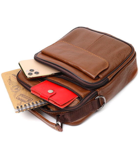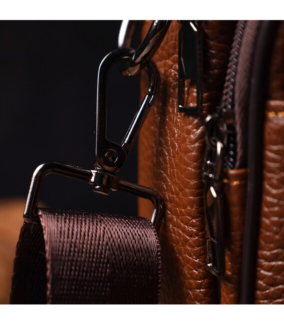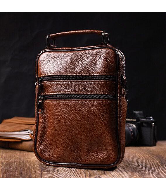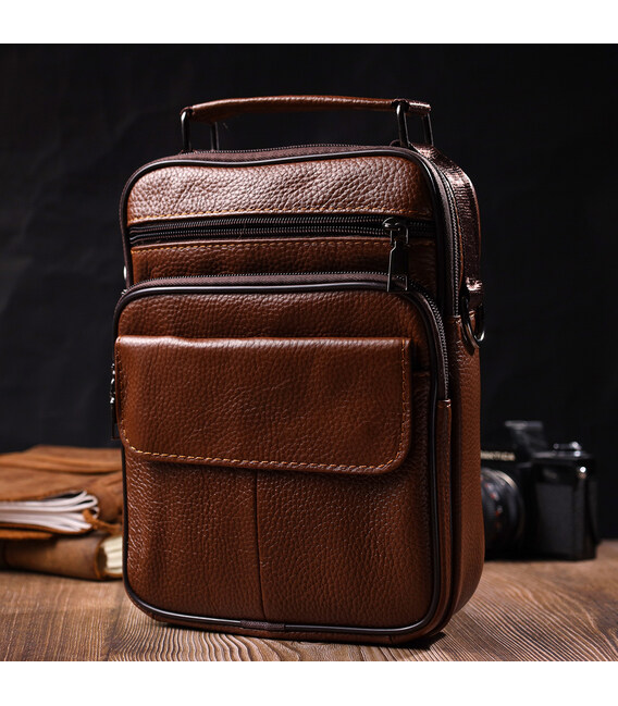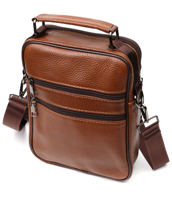 Надежная мужская удобная сумка из натуральной кожи. Аксессуар состоит из основного отделения на молнии, потайного кармана внутри, накладного кармана на молнии, на лицевой стороне, встроенного кармана на молнии на лицевой стороне, встроенного кармана под клапаном на магнитах, на лицевой стороне и двух горизонтальных карманов на молниях сзади. Носить сумку можно на плече, через плечо, а также в руках за ручку. Идеальный вариант как для делового, так и городского стиля.