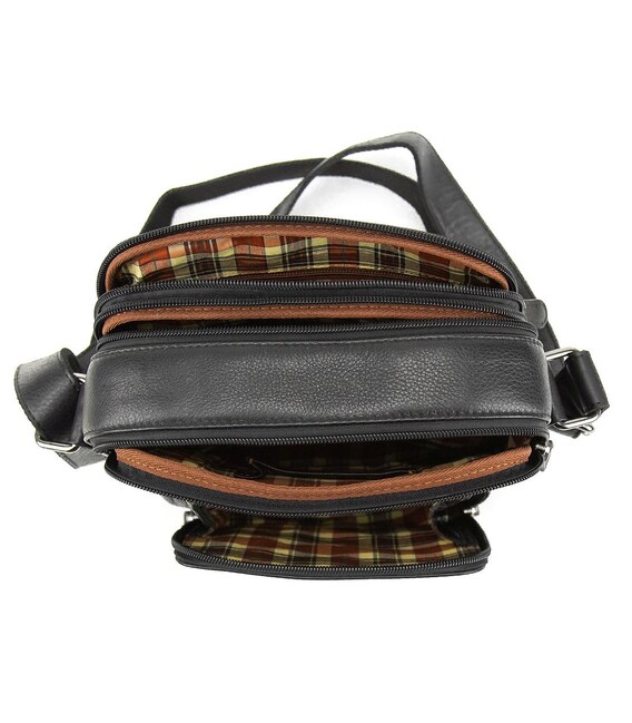 Кожаная сумка через плечо в черном цвете на три отдела Tavinchi R-1730A из натуральной кожи. Особенности: размеры сумки составляют 20 x 24,5 x 10 см. Мессенджер имеет три больших отделения которые закрываются на молнию, внутри есть карманы на змейке. На лицевой стороне два кармана. Горизонтальный и круговой, все закрываются на молнию. На тыльной стороне горизонтальный карман на змейке. Плечевой ремень кожаный на текстильной основе, регулируется по длине. Подкладка: текстильная в клеточку Цвет: черный Цвет фурнитуры: серебро Нашли эту модель дешевле? Свяжитесь с нами и мы предложим Вам самую низкую цену в Украине, так как являемся производителем данного товара.