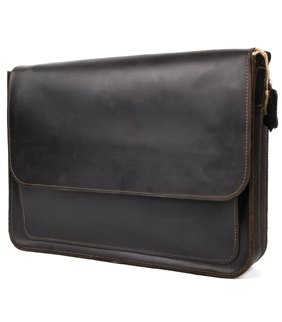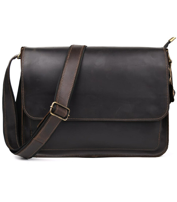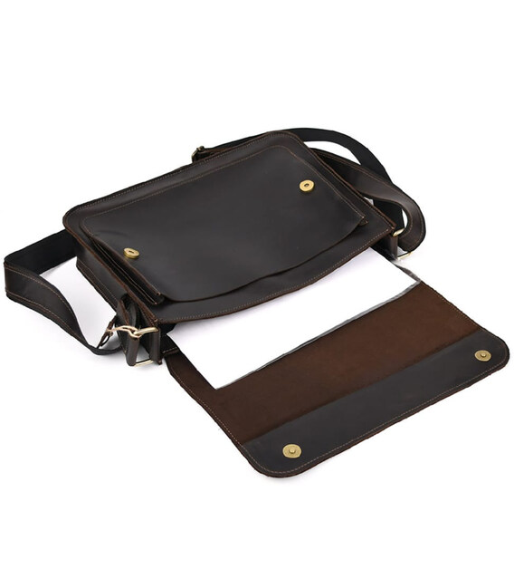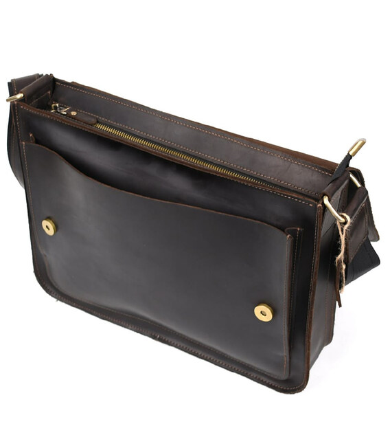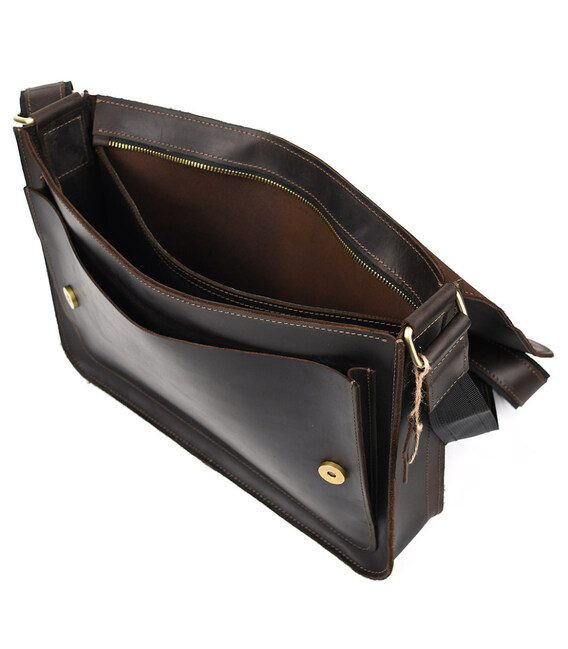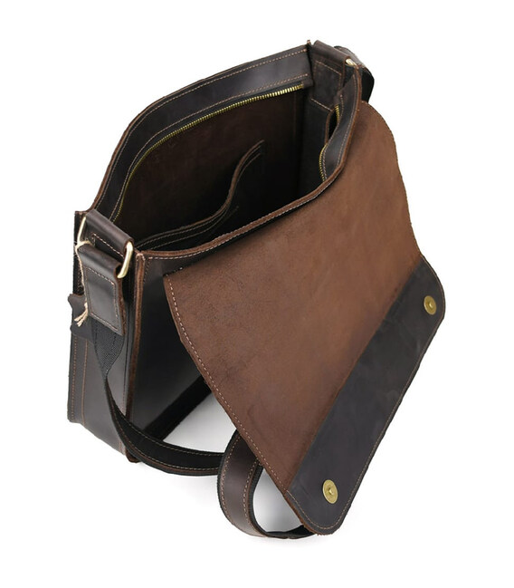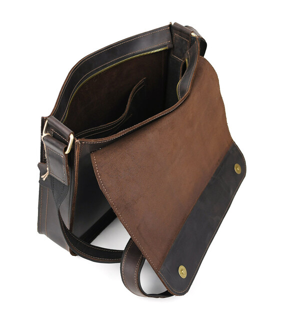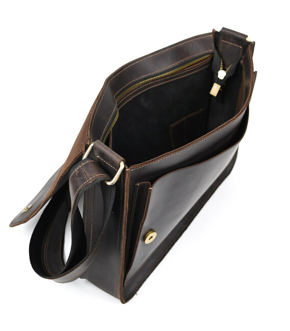 Шкіряна сумка через плече формату А4 Limary lim-3028RC коричнева із клапаном на магнітах. Усередині сумки підкладка із замші, кишеня відкрита, відділ для паперів, слоти для канцелярії. Спереду під клапаном відкрита накладна кишеня.