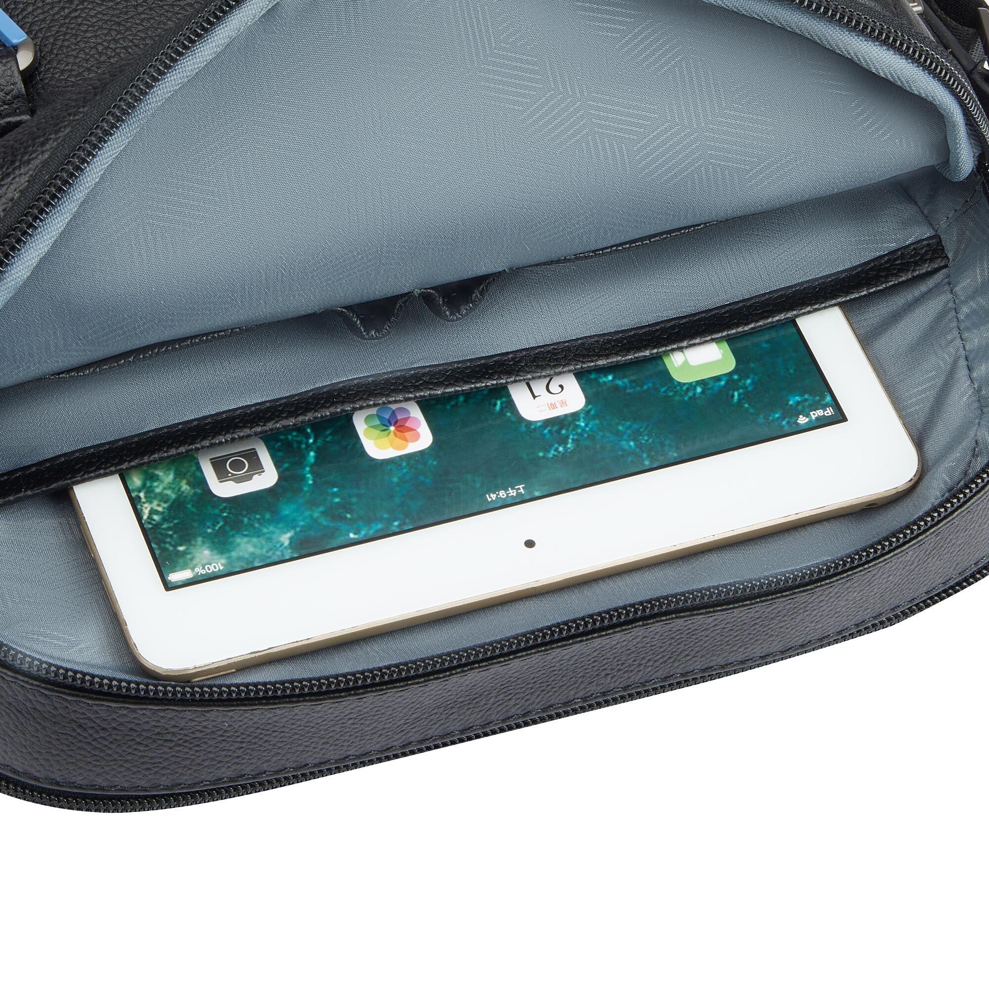 Вертикальная сумка через плечо, изготовленная из натуральной кожи. Оснащен глубоким основным отделением с отделами для смартфона, планшета 11" и пишущих предметов. С внешней стороны сумки размещен небольшой карман для вещей первой необходимости. Также, задняя часть изделия оснащена дополнительным карманом на молнии. Для удобства переноски сумка оборудована ремнем .
