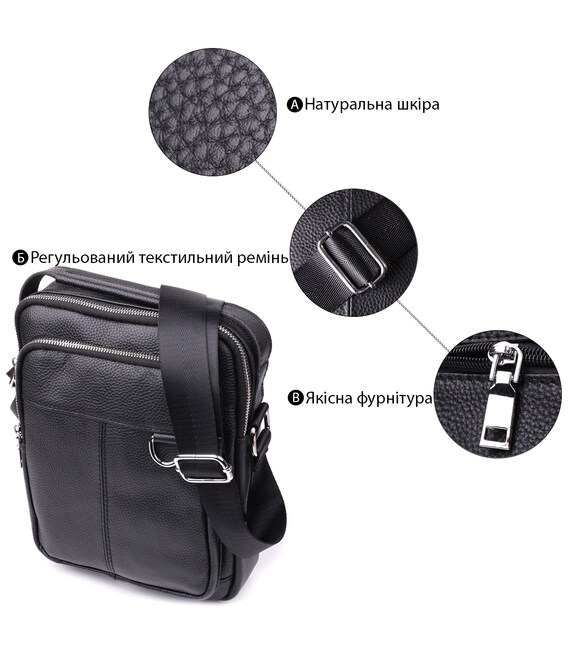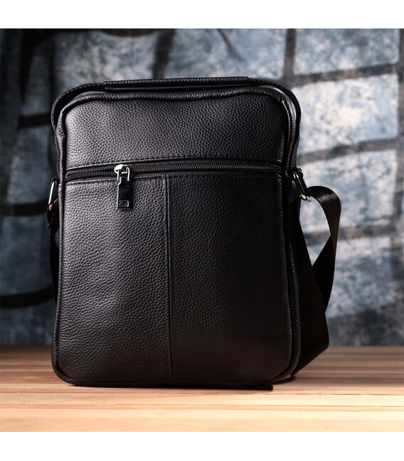 Удобная мужская сумка из натуральной кожи. Изделие выполнено из зернистой кожи черного цвета. Внутри аксессуара плотная текстильная подкладка черного цвета. Сумка будет вашим идеальным вариантом на каждый день. Модель очень удобная. Классический дизайн никогда не выйдет из моды. Такая сумка подойдет под любые вещи из вашего гардероба. Модель дополнена качественной фурнитурой в дизайн изделия.