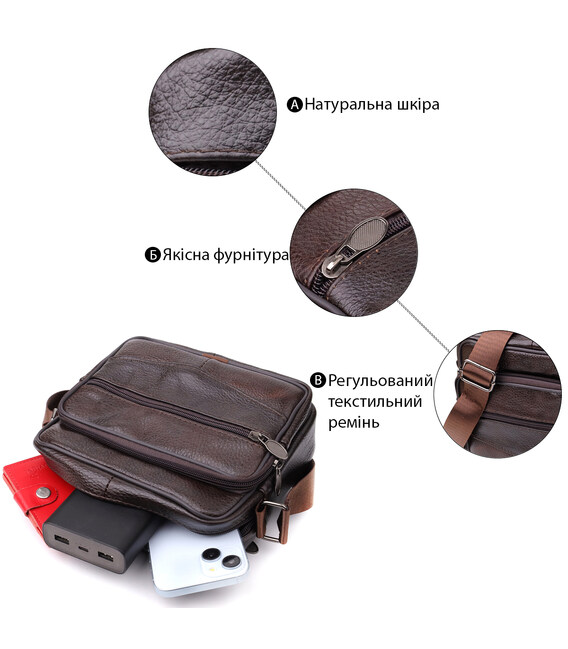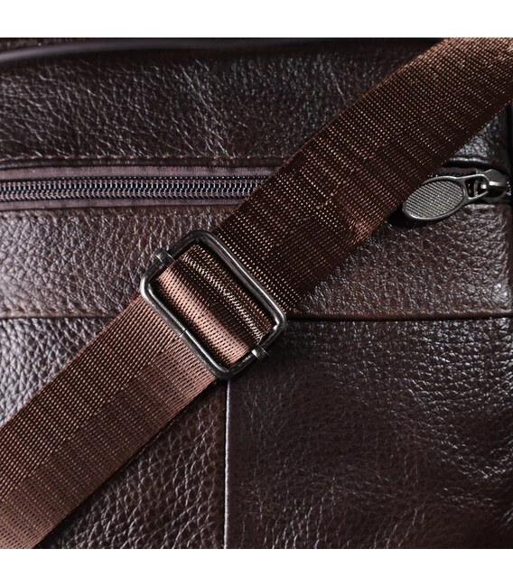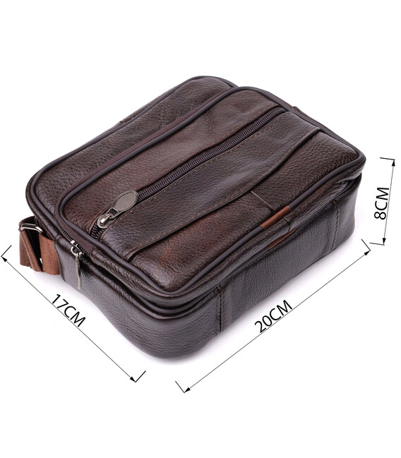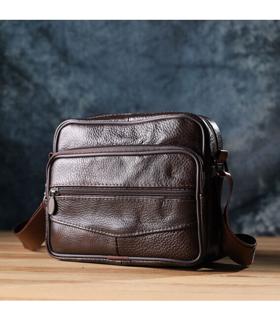 Стильная мужская сумка из высококачественной натуральной кожи, устойчивая к повреждениям и износу. Эффектный и практичный аксессуар с одним основным отделением и тремя дополнительными карманами для хранения аксессуаров, телефона и других мелочей. Ремень сумки выполнен из прочного текстиля и регулируется по длине, что обеспечивает удобство при носке. Благородный коричневый цвет модели делает её универсальной и идеально подходящей как для повседневного использования, так и для деловых встреч. Эта сумка станет отличным выбором для мужчины, ценящего комфорт и стиль в каждой детали.