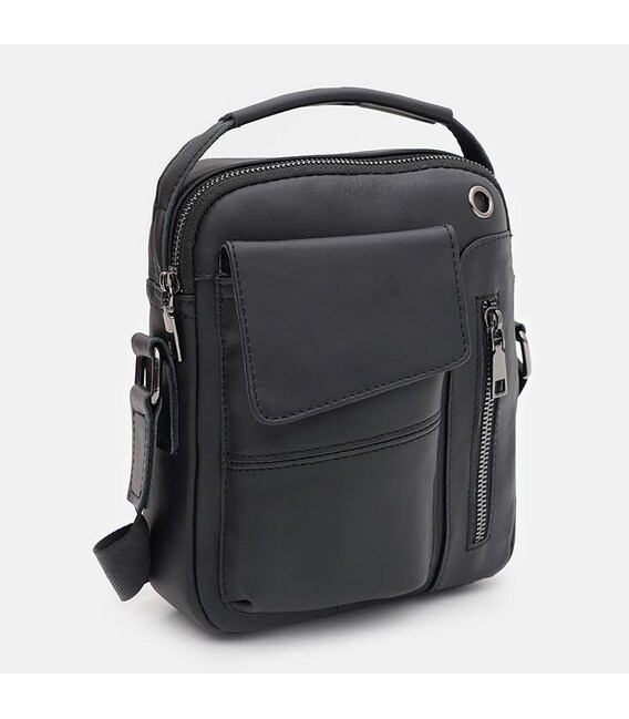 Мужская кожаная сумка закрывается на молнию. Имеет 1 основное отделение, внутри 2 кармана для телефона и мелочей. С лицевой стороны -1 карман на молнии и 1 карман -клапан / кнопка. С тыльной стороны —1 карман на молнии. Подкладка — текстиль. Плечевой ремень регулируется по длине.