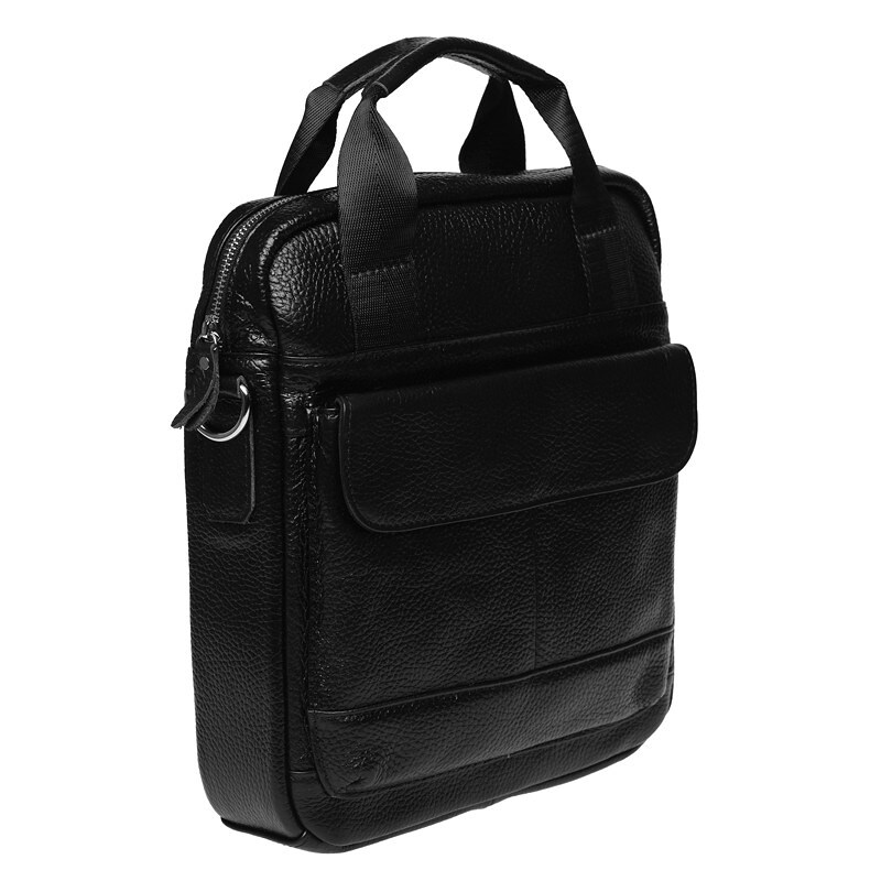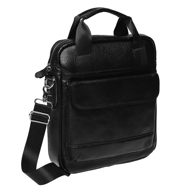 Мужкая кожаная сумка выполнена из натуральной кожи. Эту модель можно носить в руках и на плече. Имеет 1 основное отделение на молнии. Внутри 3 кармана. Снаружи 1 накладной карман на кнопках и 1 карман на молнии. Подкладка: текстиль. Цвет фурнитуры черный. В комплекте съемный плечевой ремень.