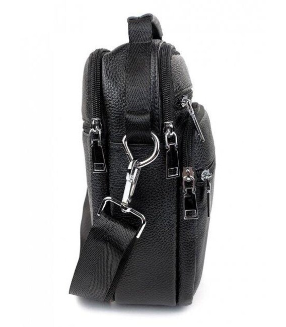 Мужской мессенджер из натуральной кожи, имеет насыщенный черный цвет и отменную металлическую фурнитуру. Также модель оснащена длинным текстильным ремнем, который регулируется по длине и мягкой кожаной ручкой. Кожаная мужская сумка с ручкой имеет два автономных отделения, которые застегиваются с помощью молний. На тыльной стороне сумки расположен один карман на молнии. На своей лицевой части сумки размещены: один достаточно вместительный карман и два дополнительных, вспомогательных, которые так же закрываются посредством молний.