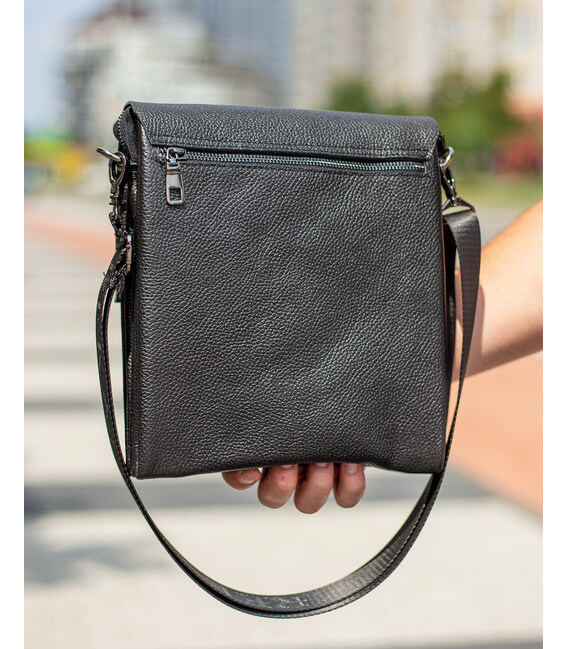 Стильная мужская сумка через плечо, выполнена из высококачественной натуральной кожи. Под накидкой находится одно основное отделение, в котором размещен потайной карман на молнии, а также карман открытого типа. Сумка имеет два дополнительных отделения: одно с лицевой части (под накидкой, без застежки) и одно с тыльной части (на молнии). Отделения застегиваются при помощи качественной фурнитуры. Ремешок сумки плотный, регулируемый, несъёмный.