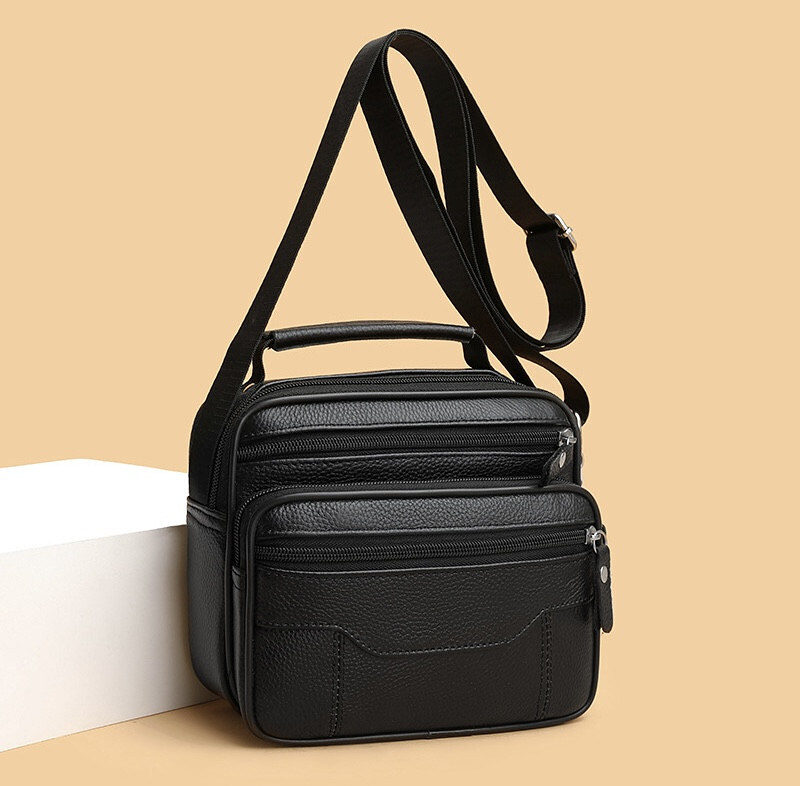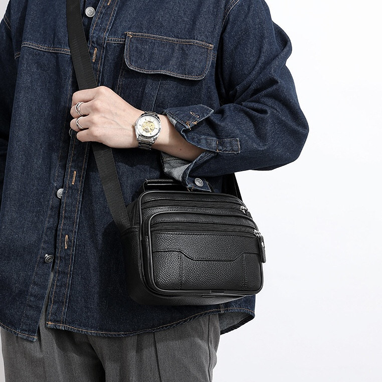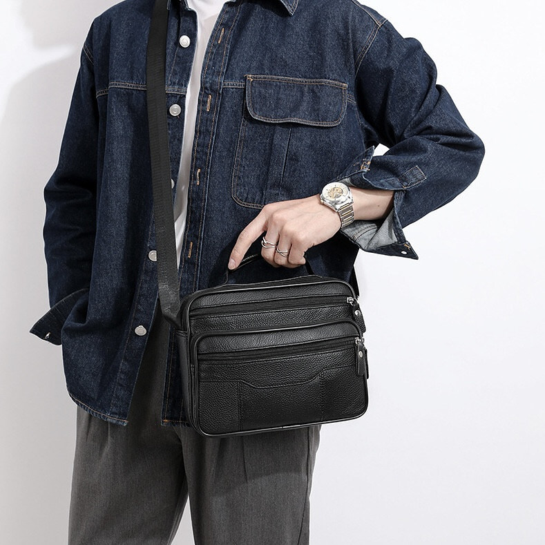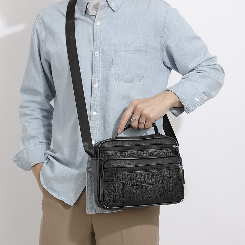 Компактная мужская сумка выполнена из высококачественной натуральной кожи. Сумка имеет одно основное отделение, в котором имеется потайной карман на молнии, а также карман открытого типа; еще три передних кармана на молнии. Есть короткая ручка для удобства. Фурнитура высокого качества. Ремешок сумки плотный, регулируемый, съёмный.