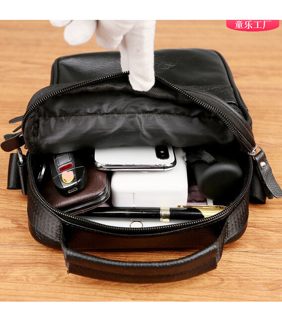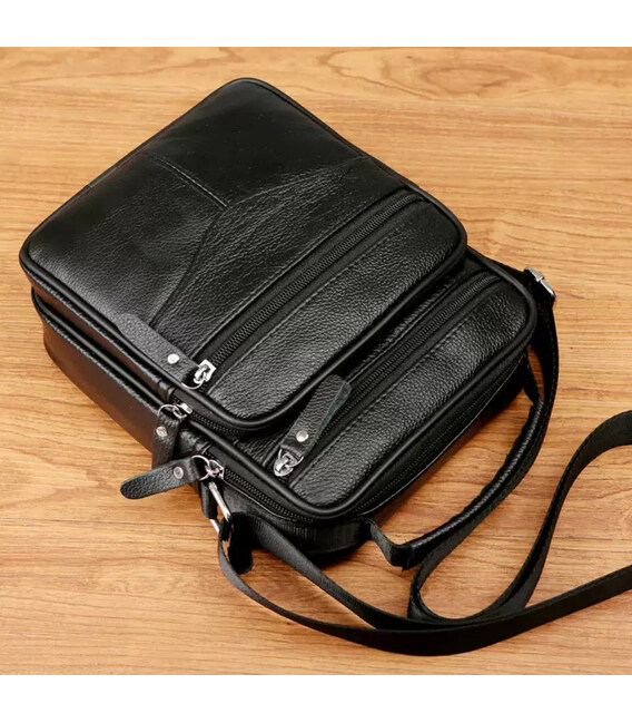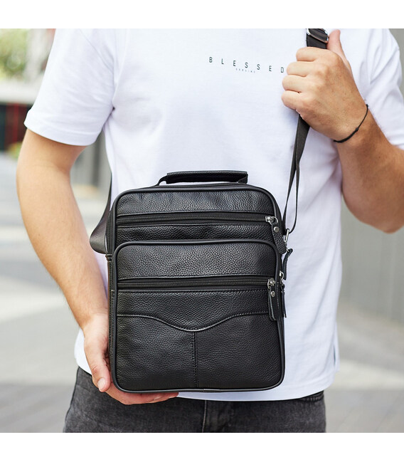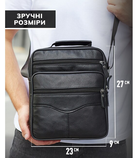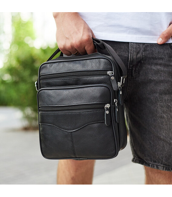 Мужской мессенджер из натуральной кожи, имеет насыщенный черный цвет и отменную металлическую фурнитуру. Также модель оснащена длинным текстильным ремнем, который регулируется по длине и мягкой кожаной ручкой. Кожаная мужская сумка с ручкой имеет два автономных отделения, которые застегиваются с помощью молний. На тыльной стороне сумки расположен один карман на молнии. На своей лицевой части сумки размещены: один достаточно вместительный карман и два дополнительных, вспомогательных, которые так же закрываются посредством молний.