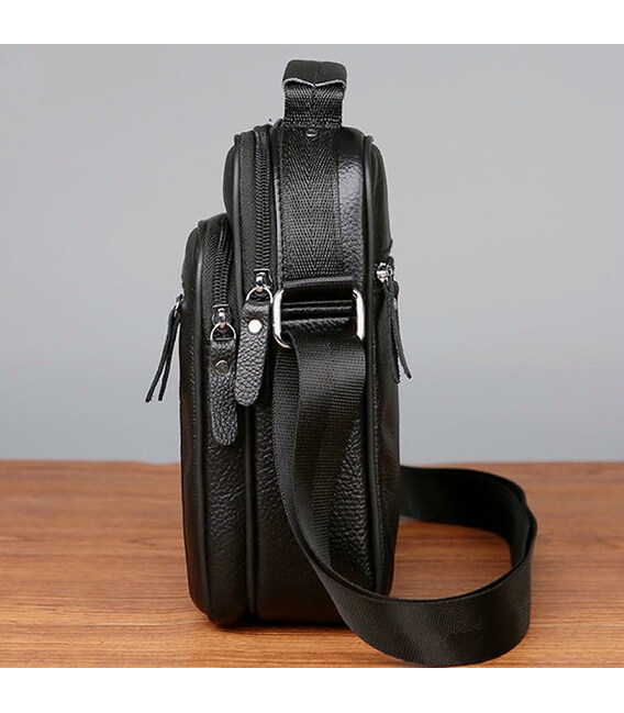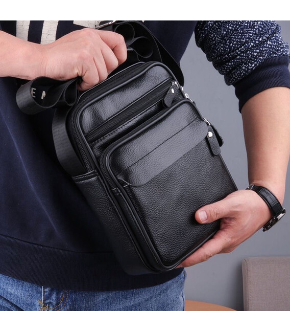 Мужской мессенджер из натуральной кожи, имеет насыщенный черный цвет и отменную металлическую фурнитуру. Также модель оснащена длинным текстильным ремнем, который регулируется по длине и мягкой кожаной ручкой. Кожаная мужская сумка с ручкой имеет два автономных отделения, которые застегиваются с помощью молний. На тыльной стороне сумки расположен один карман на молнии. На своей лицевой части сумки размещены: один достаточно вместительный карман и два дополнительных, вспомогательных, которые так же закрываются посредством молний.