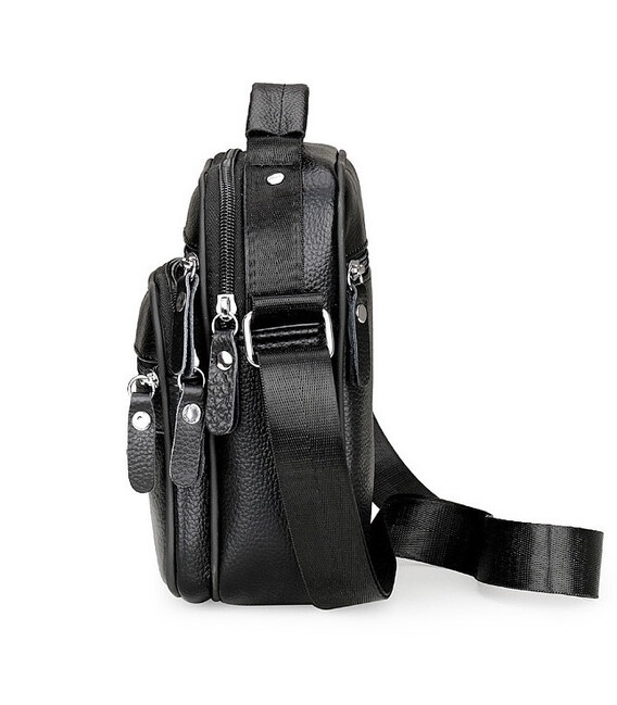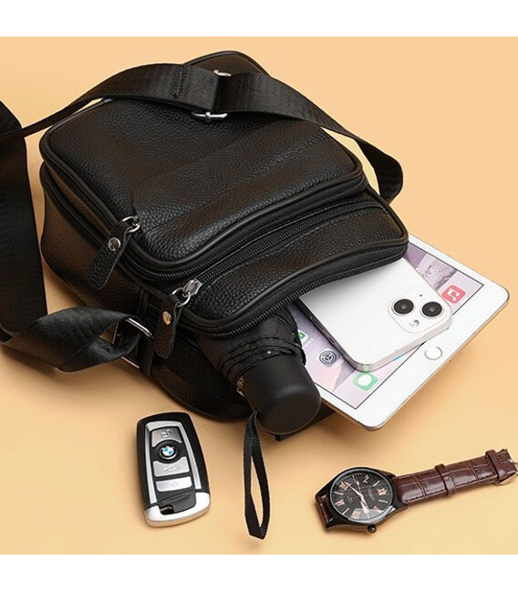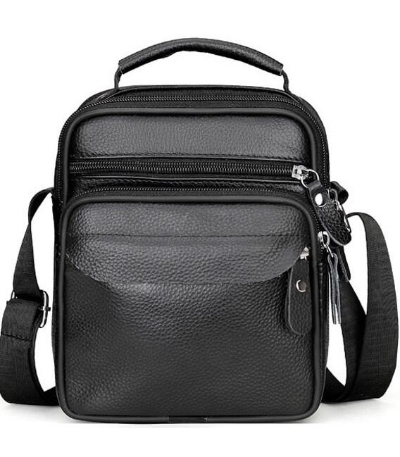Мужской мессенджер из натуральной кожи, имеет насыщенный черный цвет и отменную металлическую фурнитуру. Также модель оснащена длинным текстильным ремнем, который регулируется по длине и мягкой кожаной ручкой. Кожаная мужская сумка с ручкой имеет два автономных отделения, которые застегиваются с помощью молний. На тыльной стороне сумки расположен один карман на молнии. На своей лицевой части сумки размещены: один достаточно вместительный карман и два дополнительных, вспомогательных, которые так же закрываются посредством молний.
