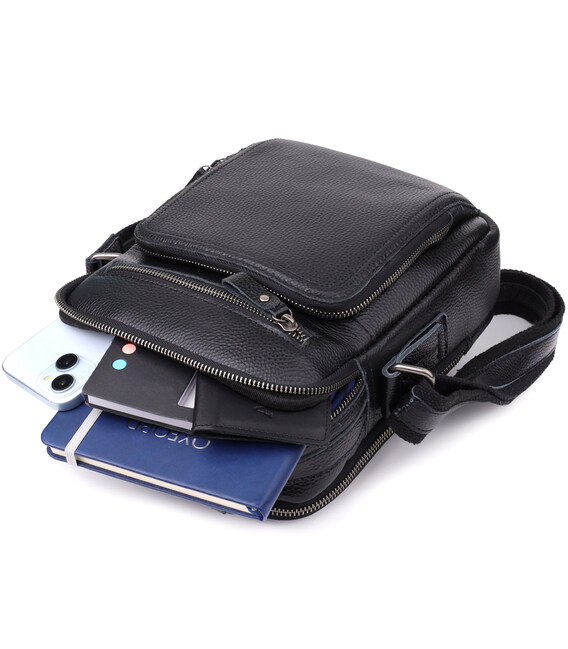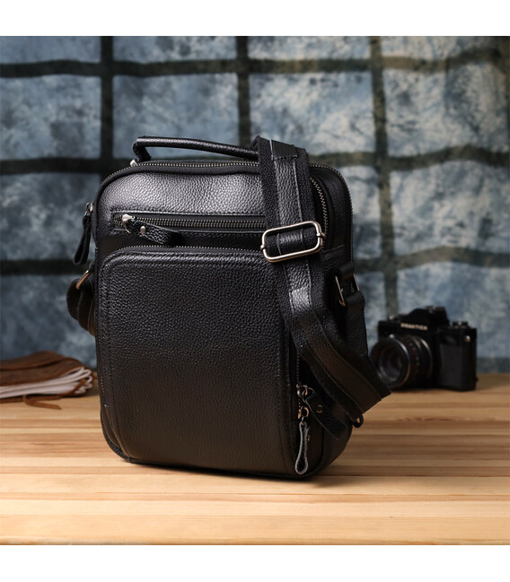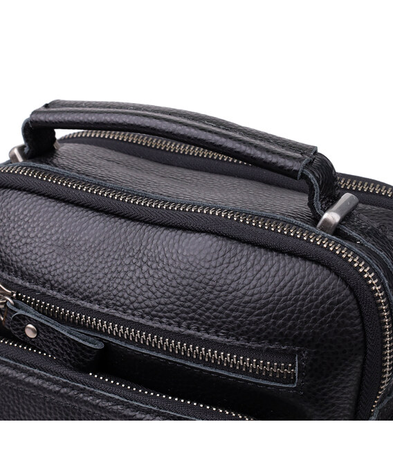 Черная кожаная сумка на плечо — практичный и стильный аксессуар для повседневного использования. Модель выполнена из натуральной зернистой кожи флотар, устойчива к износу и сохраняет аккуратный внешний вид. Оснащена двумя основными отделениями на молнии, в одном из которых предусмотрен потайной карман. На лицевой стороне размещены накладной карман на молнии и горизонтальный встроенный карман. На тыльной стороне — удобный карман на молнии. Сумка дополнена прочной кожаной ручкой и регулируемым несъемным кожаным ремешком для ношения на плече. Фурнитура цвета серебра придает модели сдержанную элегантность.