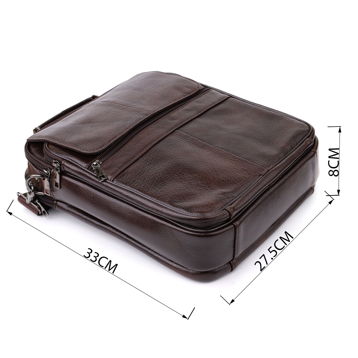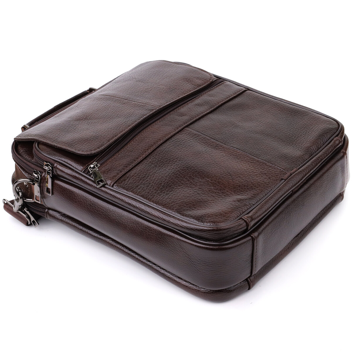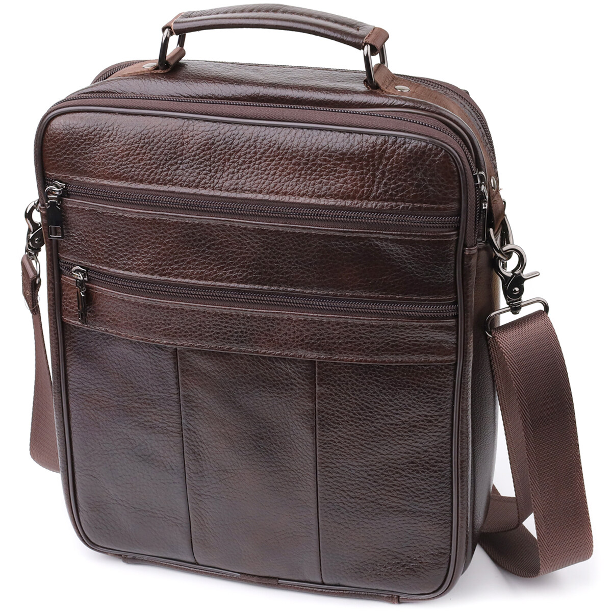 Мужская кожаная сумка выполнена из высококачественной натуральной кожи и сочетает в себе функциональность и стиль. Модель оснащена двумя основными отделениями на молнии, одно из которых включает потайной карман на молнии на задней стенке для надежного хранения важных мелочей.