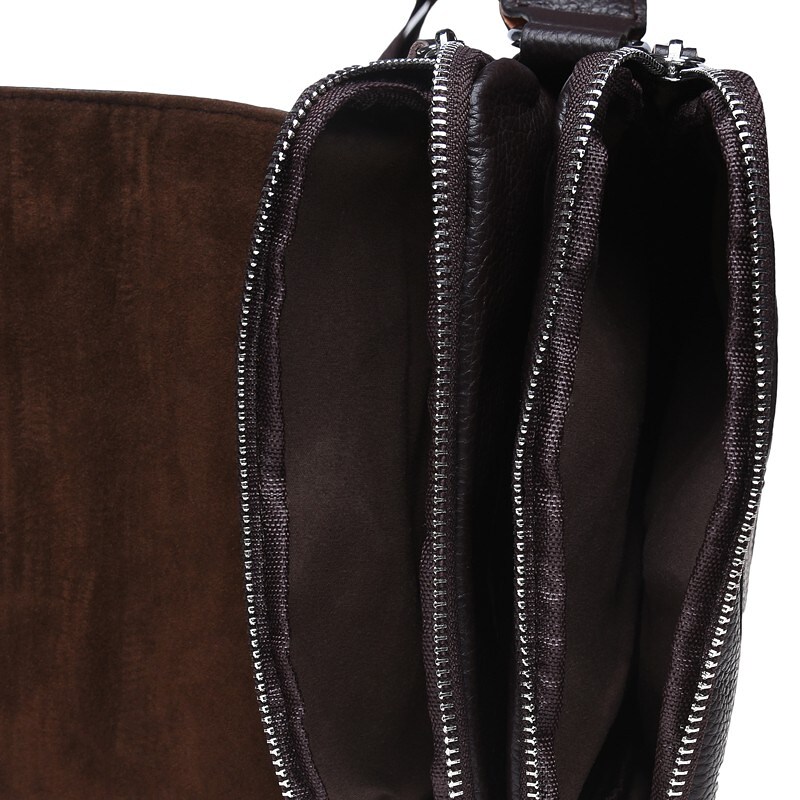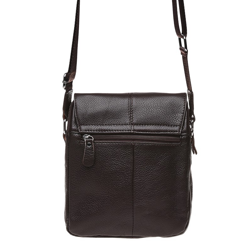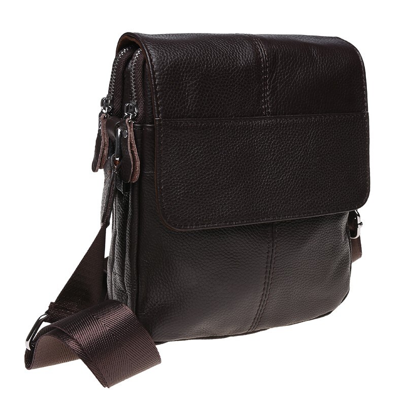Кожаная сумка на плечо для мужчин. Закрывается на клапан. Имеет 3 отдела. Два отдела закрываеются на молнию, между ними отдел, в котором находятся 3 кармана. С лицевой стороны- накладной карман на кнопках. С тыльной стороны- карман на молнии. Подкладка- текстиль. Цвет фурнитуры-серебро. Плечевой ремень регулируется по длине.