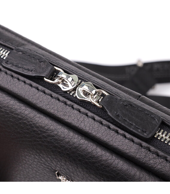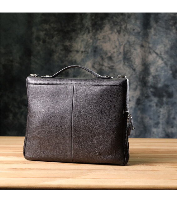 Сумка выполнена из натуральной кожи черного цвета и оснащена кожаной ручкой для переноски, а также съемным текстильным ремнем. Основное отделение закрывается на молнию. Внутри расположен отдельный карман для планшета на молнии и дополнительный потайной карман. Фурнитура цвета серебро подчеркивает современный стиль и элегантность модели.