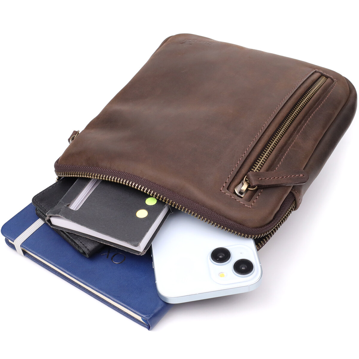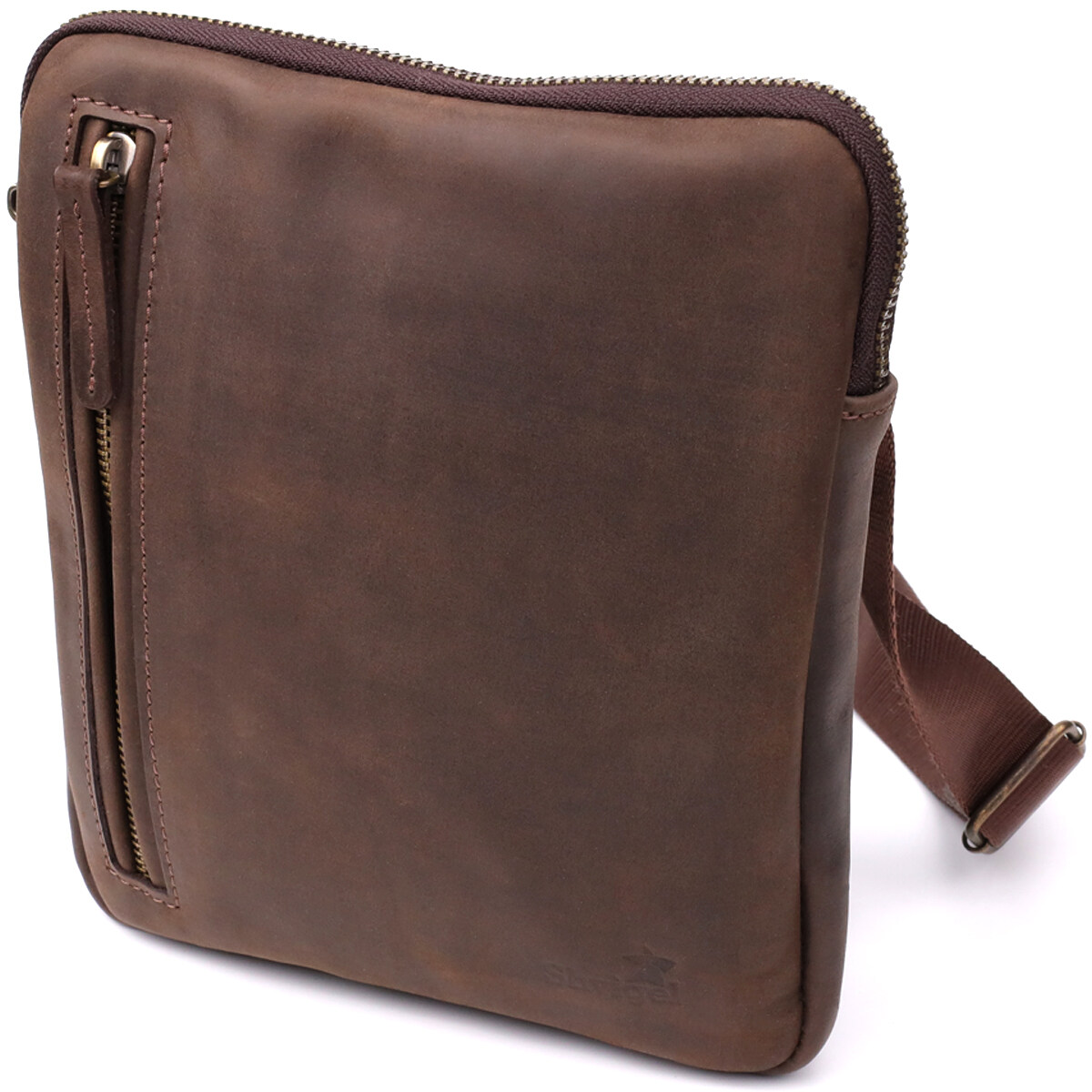 Стильная мужская вертикальная сумка SHVIGEL выполнена из натуральной коричневой винтажной кожи, которая со временем приобретает благородный оттенок и шарм. Компактный размер и продуманное внутреннее наполнение делают аксессуар практичным и удобным для повседневного использования.