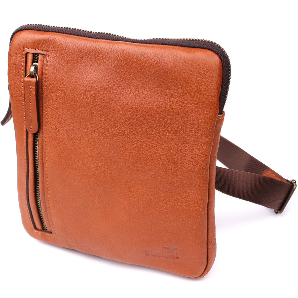 Эта мужская вертикальная сумка от украинского бренда SHVIGEL выполнена из натуральной зернистой кожи теплого рыжего оттенка. Структурированная фактура придает изделию солидный и благородный вид, а фирменное тиснение логотипа подчеркивает подлинность и стиль бренда.