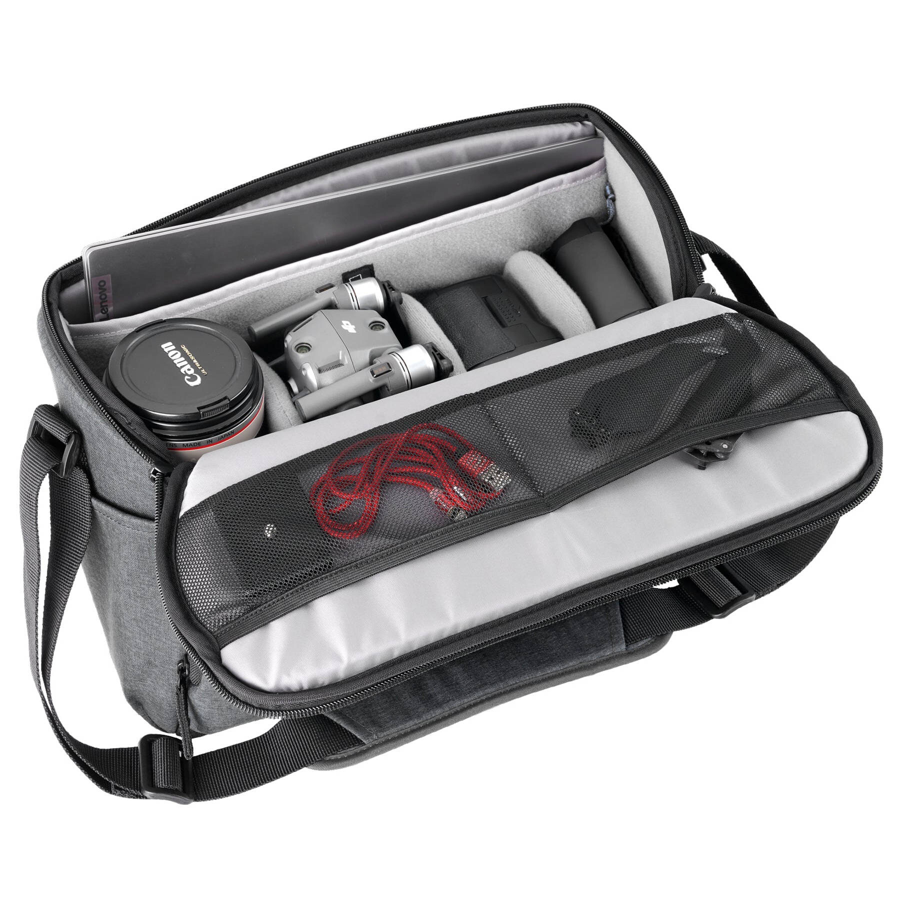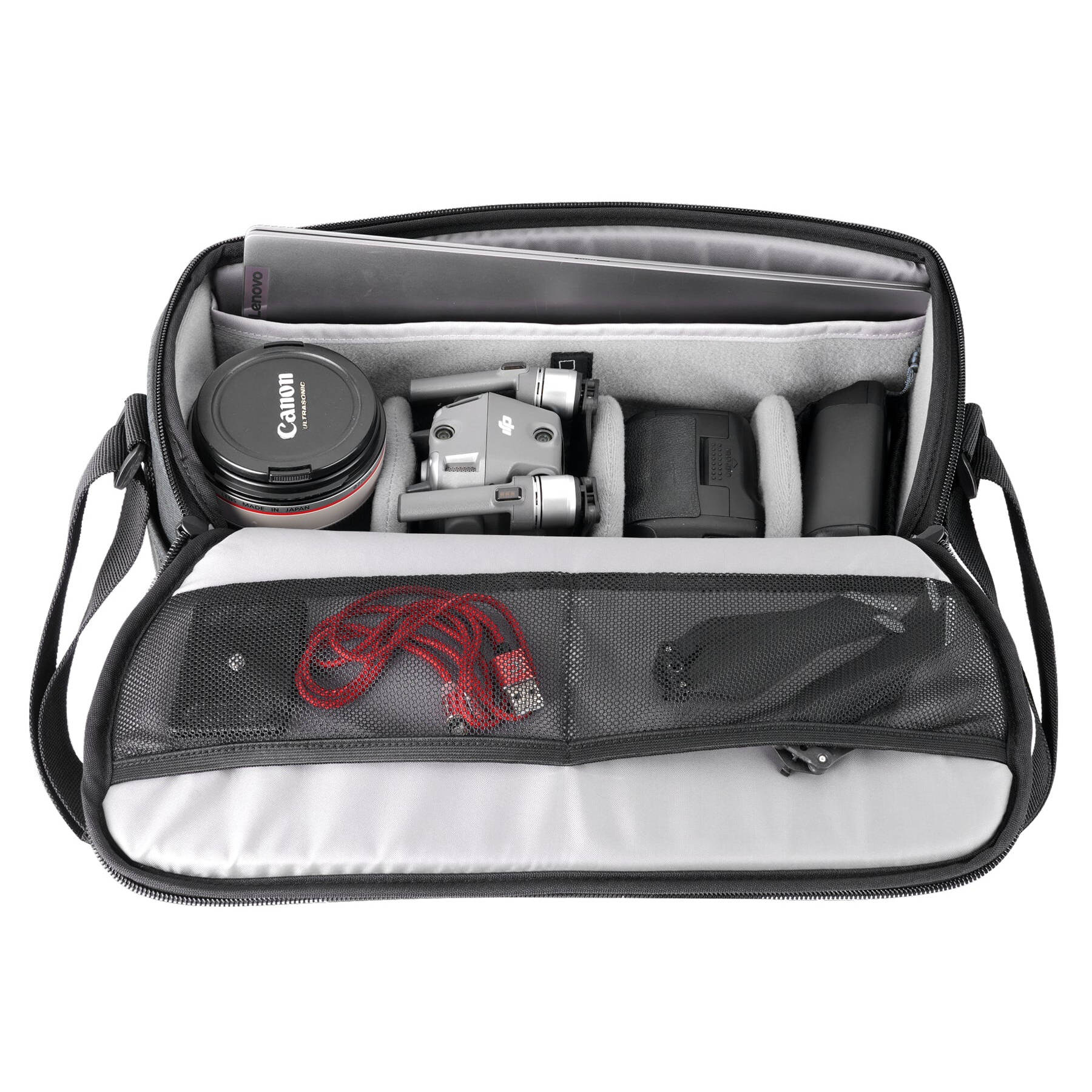 Сумка рассчитана на размещение зеркальной цифровой камеры, 4–5 объективов (в том числе 70–200 мм), фотовспышки, небольшого дрона (типа Mavic), зарядного устройства и аксессуаров. Отдельное защищенное отделение предназначено для ноутбука или планшета с диагональю до 14". Это делает модель универсальной для фото- и видеосъемки, путешествий и даже ежедневного использования.