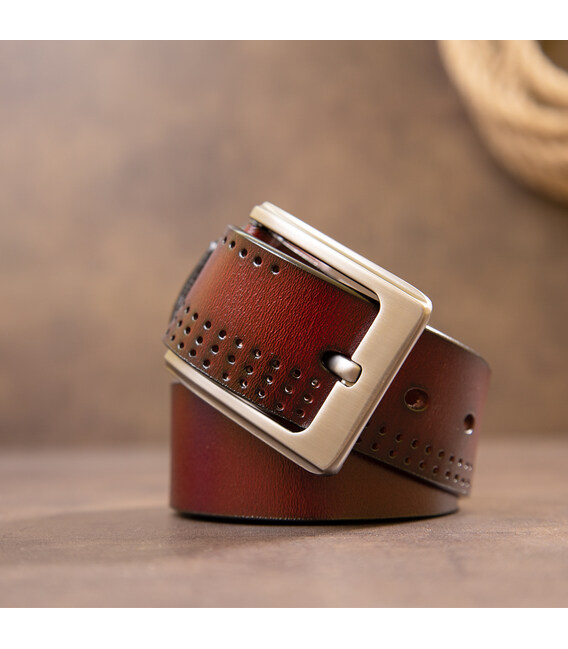 Стильный ремень в плотной коже и насыщенном коричневом цвете. Дизайн ремешка дополнен мелкими дырками по всей длине. Аксессуар с классической массивной пряжкой из плотного металла светло-серебристого цвета. Изделие прекрасно подчеркнет ваш образ. Подойдет под любой стиль. Качественный ремень - базовая часть гардероба любого мужчины. Производство - фабричный Китай высокого качества.
