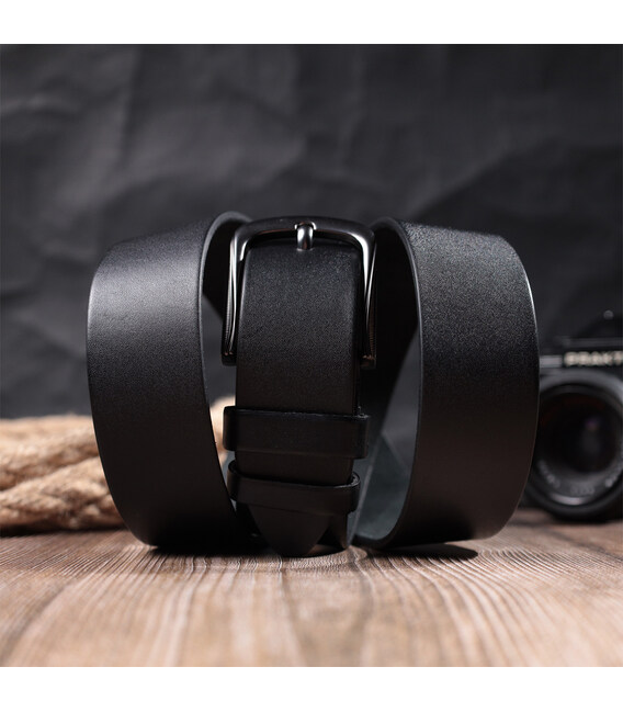 Мужской кожаный ремень классического черного цвета. Изделие выполнено из натуральной кожи. Пряжка - темного цвета. Модель прекрасно подойдет под любой образ. Качественный ремень - обязательный элемент гардероба любого мужчины. Аксессуар прекрасно подойдет в качестве подарка для любого мужчины.
