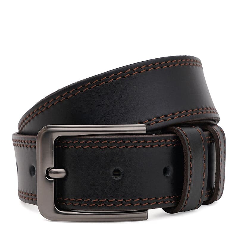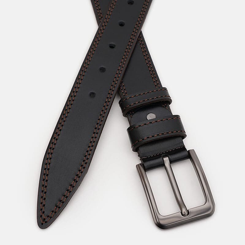 Мужской кожаный ремень. Качественные материалы, стильная пряжка и аккуратный внешний вид. Ремень выполнен из натуральной кожи и металлической фурнитуры. Лицевая сторона ремня защищена от влаги, жира и агрессивных сред. Уход – минимальный (сухая чистка). При необходимости, ремень можно укоротить самостоятельно до нужной вам длины.