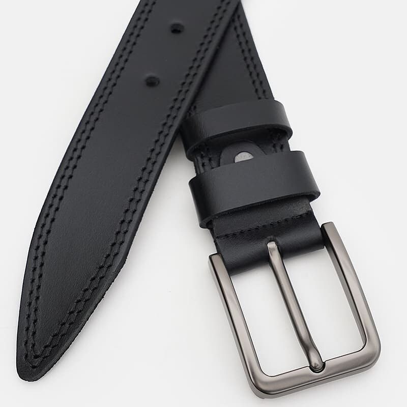 Мужской кожаный ремень. Качественные материалы, стильная пряжка и аккуратный внешний вид. Ремень выполнен из натуральной кожи и металлической фурнитуры. Лицевая сторона ремня защищена от влаги, жира и агрессивных сред. Уход – минимальный (сухая чистка). При необходимости, ремень можно укоротить самостоятельно до нужной вам длины.