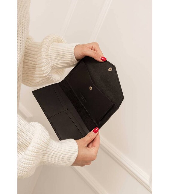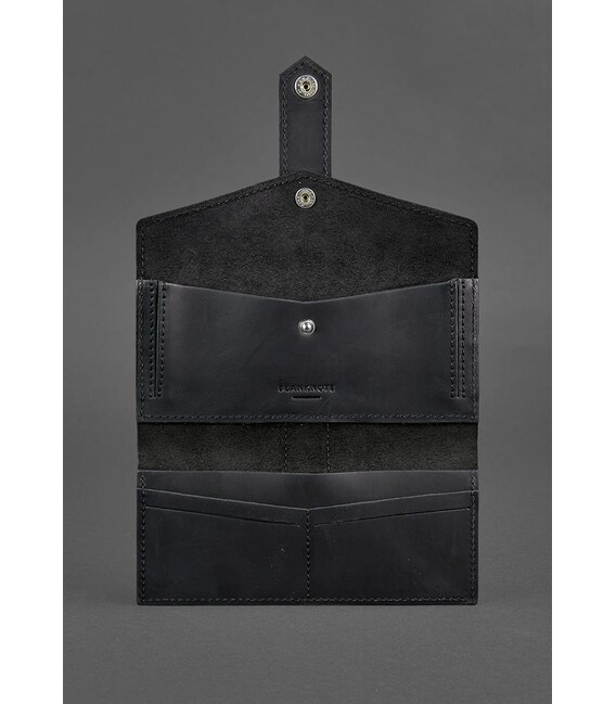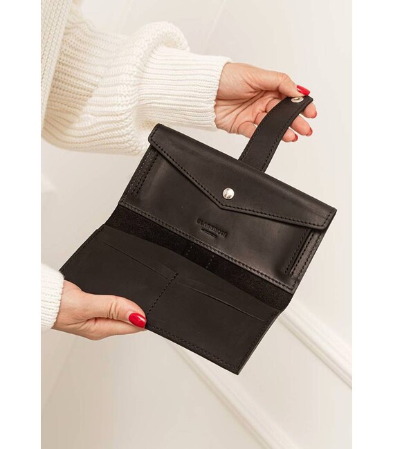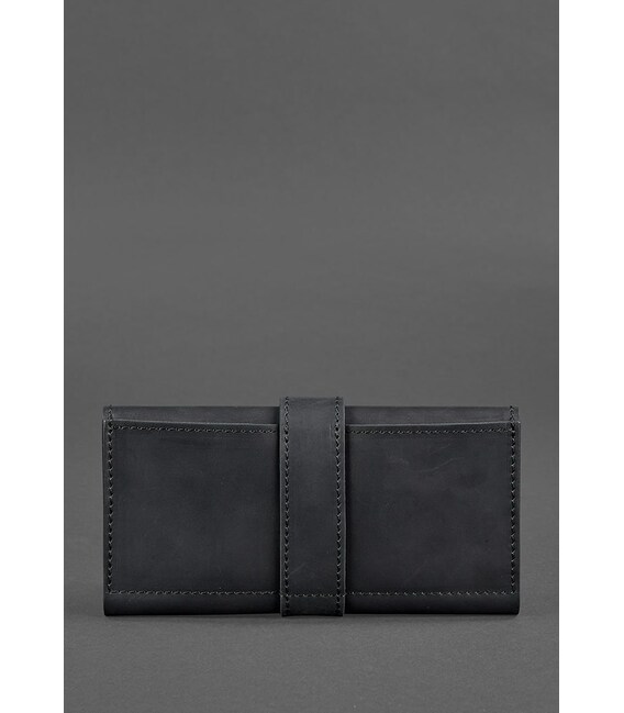 Стильное портмоне в черном цвете, которое можно использовать в качестве клатча. Изготовлено из натуральной кожи Crazy Horse. Она имеет очень приятную матовую поверхность и умент красиво стариться: со временем изделие приобретает очень винтажный вид.Внутри имеется просторное отделение для купюр, 4 слота для карточек и карман для монет и прочей мелочи, закрывающийся на кнопку.Также имеется наружный карман на задней стенке аксессуара. Закрывается портмоне на хлястик с кнопкой.Сделано полностью вручную в нашей мастерской в Киеве.Гарантия на портмоне - 3 года с момента покупки.ВНИМАНИЕ! Выделка данной кожи предполагает естественное появление на ней царапин и потертостей в ходе использования! От этого изделие становится более индивидуальным и приятным, это оценят настоящие поклонники винтажного стиля:) А так же первое время кожа может краситься при сильном трении об другие предметы - это особенность её выделки, постепенно этот эффект уменьшается, кожа полируется и приобретает чуть глянцевый эффект.Фурнитура и комплектация может быть изменена производителем