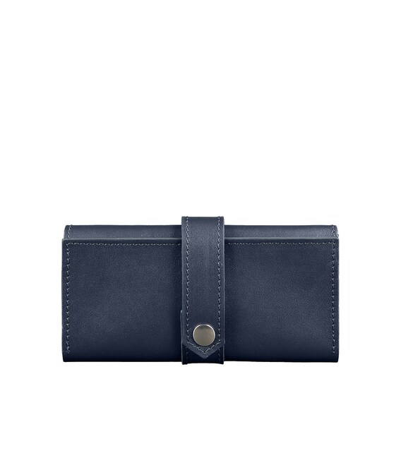 Стильное портмоне в темно-синем цвете, которое можно использовать в качестве клатча. Изготовлено из натуральной кожи Krast. Поверхность этой кожи устойчива к царапинам и потертостям.Внутри портмоне имеется просторное отделение для купюр, 4 слота для пластиковых карточек, а также карман для монет и прочей мелочи, закрывающийся на кнопку.Снаружи, на задней стенке аксессуара, располагается еще один карман, в котором можно поместить телефон или документы. Закрывается портмоне на хлястик с кнопкой.Гарантия на портмоне - 3 года с момента покупки.Фурнитура и комплектация может быть изменена производителем