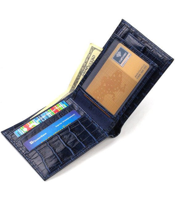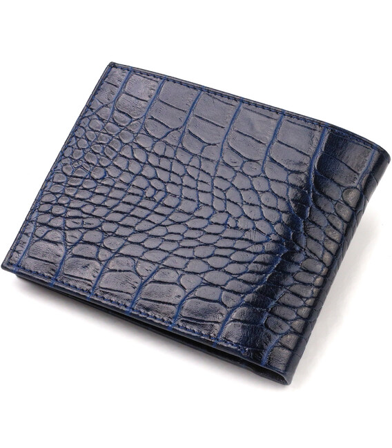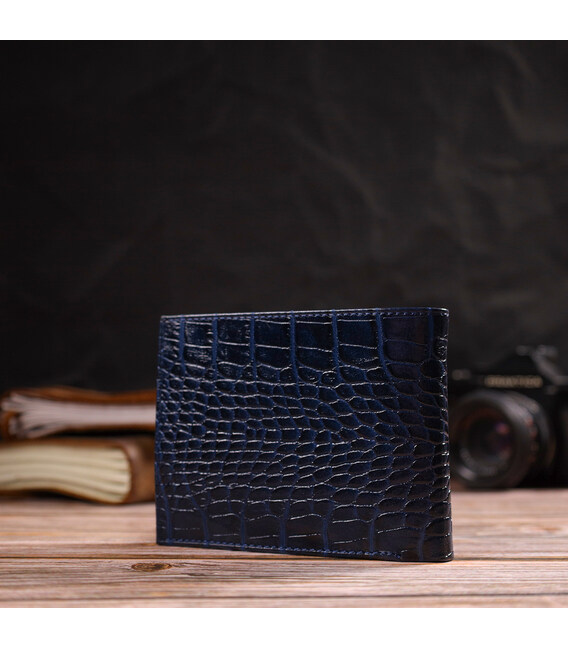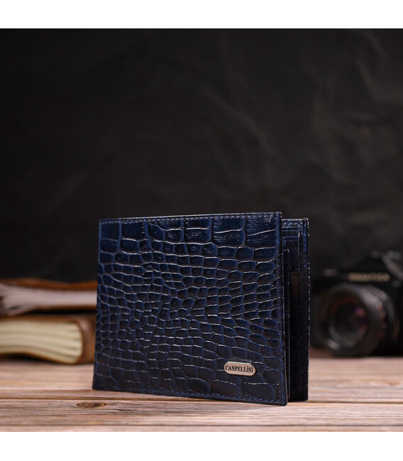 Описание Красивый горизонтальный мужской бумажник среднего размера из натуральной кожи с тиснением под крокодила CANPELLINI 21861 Синий