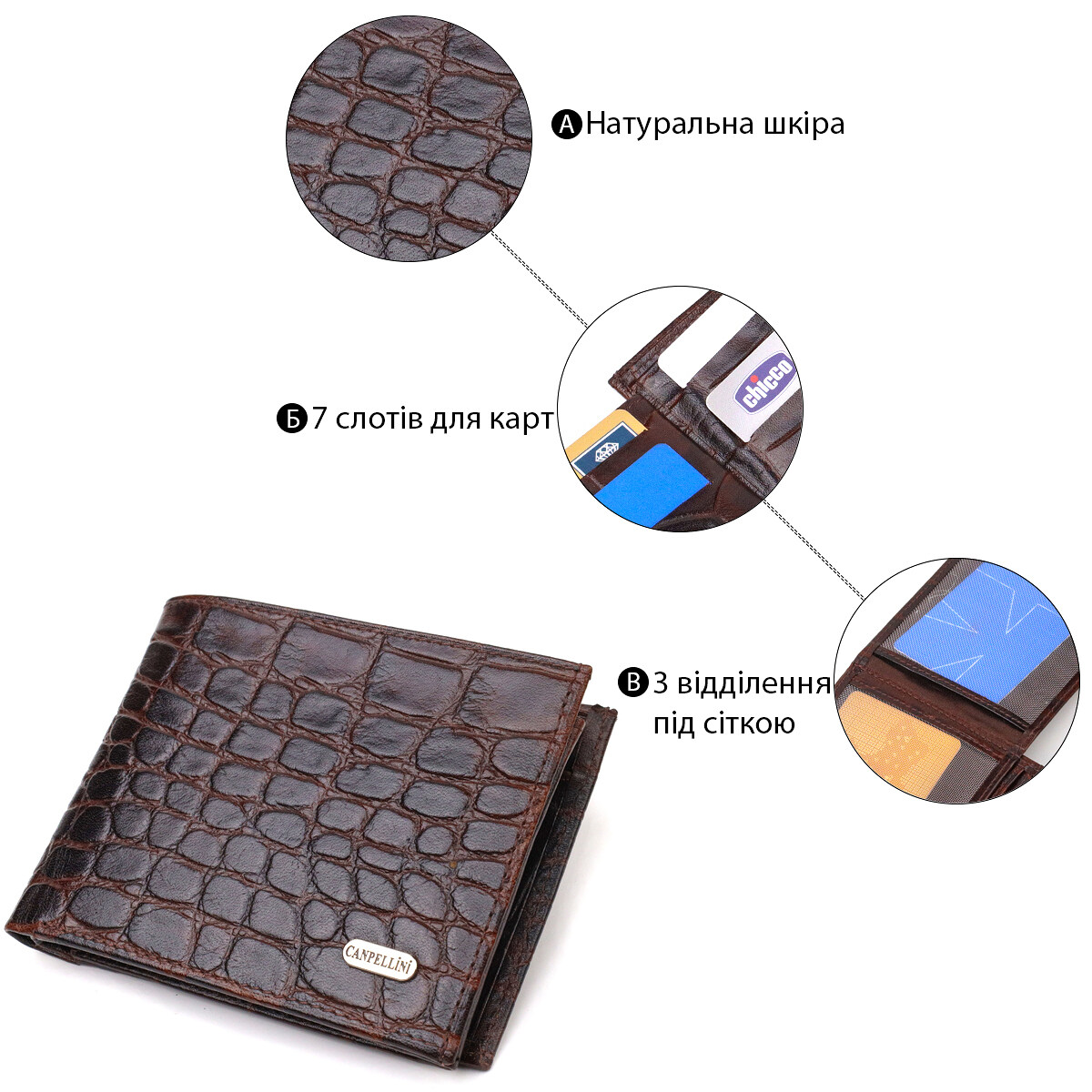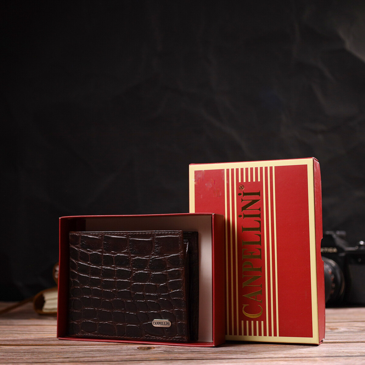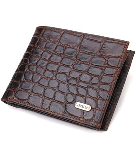Качественный и приятный на ощупь мужской бумажник из натуральной кожи с тиснением под крокодила. Аксессуар имеет основное отделение для купюр, семь ячеек для кредиток, три кармана под сеточкой для пропусков, два скрытых кармана, карман на молнии. На лицевой стороне, в правом нижнем углу металлический логотип компании производителя. Если Вы выбрали товар этой фирмы, можете не сомневаться, что изделие прослужит очень долго и не потеряет свой первоначальный вид.