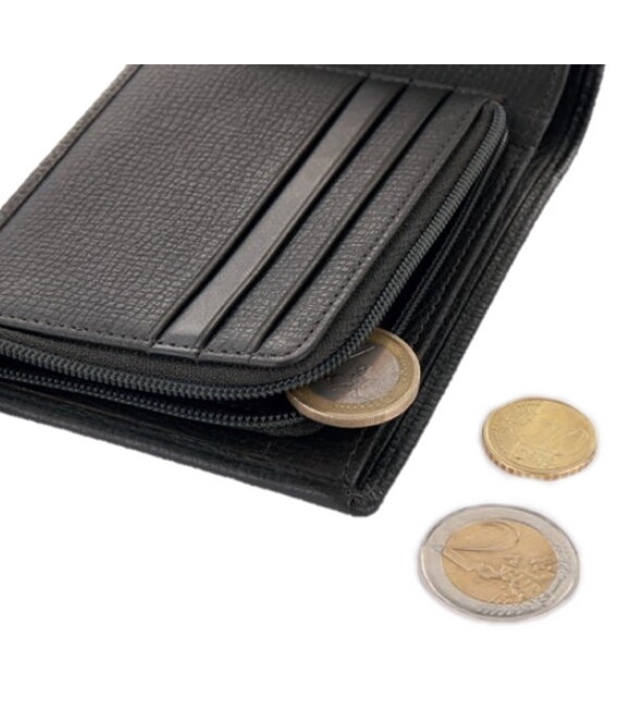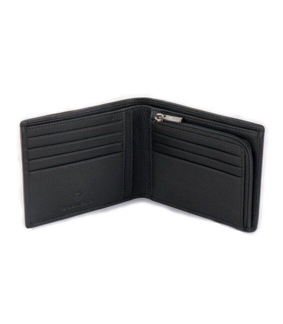 Портмоне имеет два отделения для банкнот, семь слотов для кредитных карт, которые оснащены RFID-защитой, карманы для документов, также карман на молнии для мелочи.