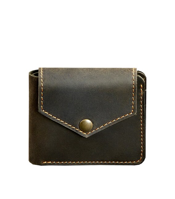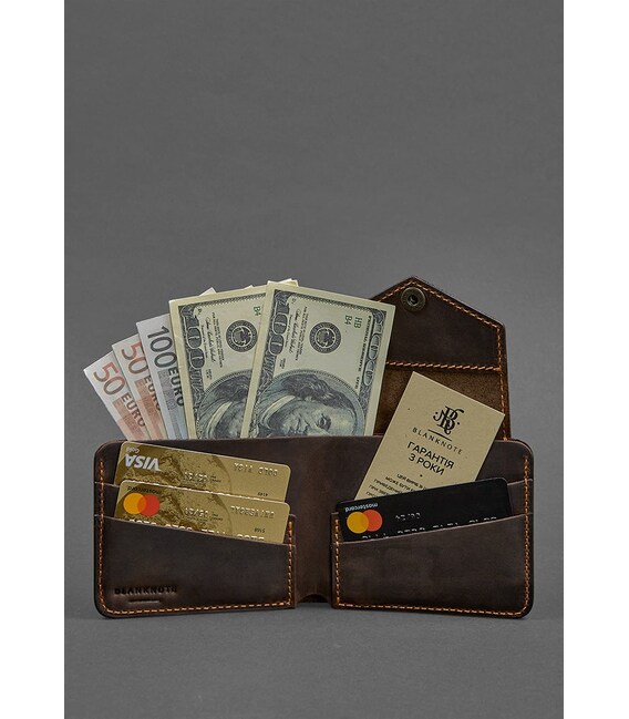 Классическая модель - стильное компактное портмоне с небольшим отделением для монет. Внутри есть одно отделение для купюр и 4 отделения для кредитных карт и визиток. Портмоне закрывается на клапан, который формирует небольшую монетницу, закрывающуюся на кнопку с внешней стороны изделия. Подходит для любых купюр, в том числе - для евро и долларов.Сделано полностью вручную в нашей мастерской в Киеве. Гарантия на портмоне - 3 года с момента покупки. ВНИМАНИЕ! Выделка данной кожи предполагает естественное появление на ней царапин и потертостей в ходе использования! От этого изделие становится более индивидуальным и приятным, это оценят настоящие поклонники винтажного стиля:) А так же первое время кожа может краситься при сильном трении об другие предметы - это особенность её выделки, постепенно этот эффект уменьшается, кожа полируется и приобретает чуть глянцевый эффект. Фурнитура и комплектация может быть изменена производителем