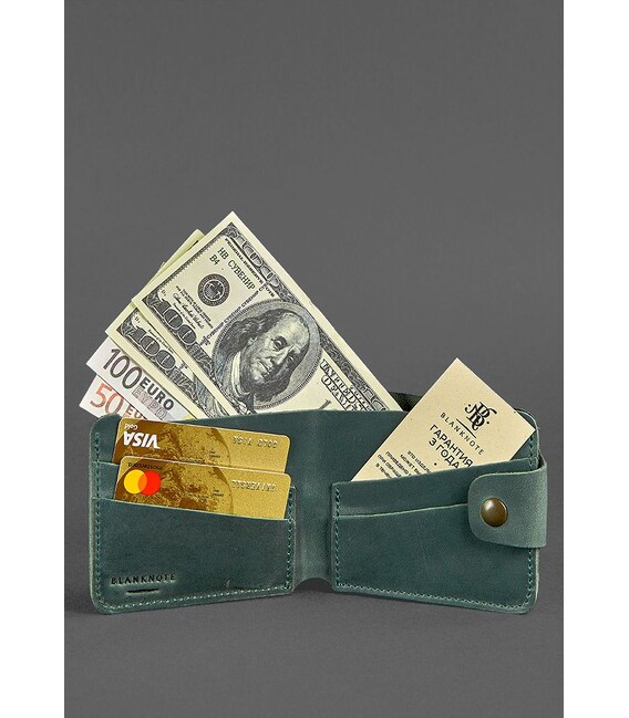 Надоели классические черные и коричневые оттенки? Присмотритесь к портмоне в изумрудном цвете. Такой темный и глубокий зеленый в сочетании с лаконичным дизайном понравиться как прекрасным женщинам, так и брутальным мужчинам.Этот кошелек будет служить Вам не один год, так как изготовлен из натуральной кожи. И даже незначительные потертости и шероховатости, которые могут появиться со временем, только добавят некую самобытность и винтажность аксессуару.Еще одно безусловное достоинство аксессуара – компактность. Он не займет много места в сумке или рюкзаке, даже, поместиться в кармане брюк или жакета. Это очень удобно и практично.При этом функциональность и вместительность остаются на высоте. Кошелек имеет два отделения для купюр и четыре кармана для карточек или визиток. Закрывается на прочную металлическую кнопку.Гарантия на портмоне – 3 года с момента покупки!ВНИМАНИЕ! Выделка данной кожи предполагает естественное появление на ней царапин и потертостей в ходе использования! От этого изделие становится более индивидуальным и приятным, это оценят настоящие поклонники винтажного стиля:) А так же первое время кожа может краситься при сильном трении об другие предметы - это особенность её выделки, постепенно этот эффект уменьшается, кожа полируется и приобретает чуть глянцевый эффект.Фурнитура и комплектация может быть изменена производителем