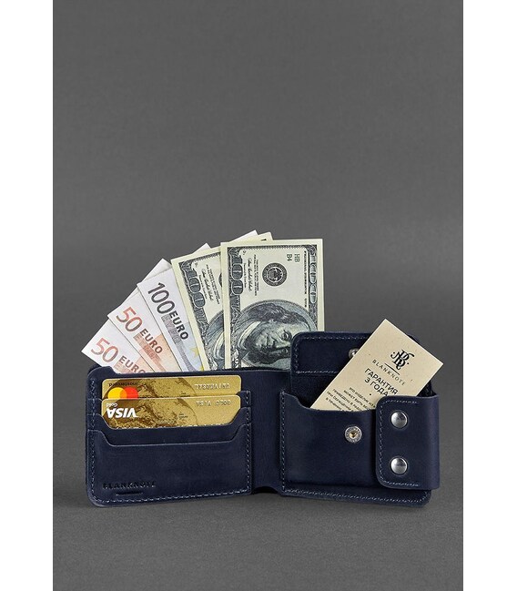 Стильное и практичное портмоне из натуральной кожи. Классическая модель с отделением для монет. Внутри два просторных отделения для купюр, что позволяет удобно распределить наличные. Дополнительно предусмотрено 4 отделения для кредитных карт и визиток.Портмоне надежно закрывается на кнопки.Подходит для любых купюр, в том числе - для евро и долларов.Для изготовления портмоне использовалась кожа Crazy Horse в темно-синем цвете. Сделано полностью вручную в нашей мастерской в Киеве.Гарантия на портмоне - 3 года с момента покупки.ВНИМАНИЕ! Выделка данной кожи предполагает естественное появление на ней царапин и потертостей в ходе использования! От этого изделие становится более индивидуальным и приятным, это оценят настоящие поклонники винтажного стиля:) А так же первое время кожа может краситься при сильном трении об другие предметы - это особенность её выделки, постепенно этот эффект уменьшается, кожа полируется и приобретает чуть глянцевый эффект.Фурнитура и комплектация может быть изменена производителем