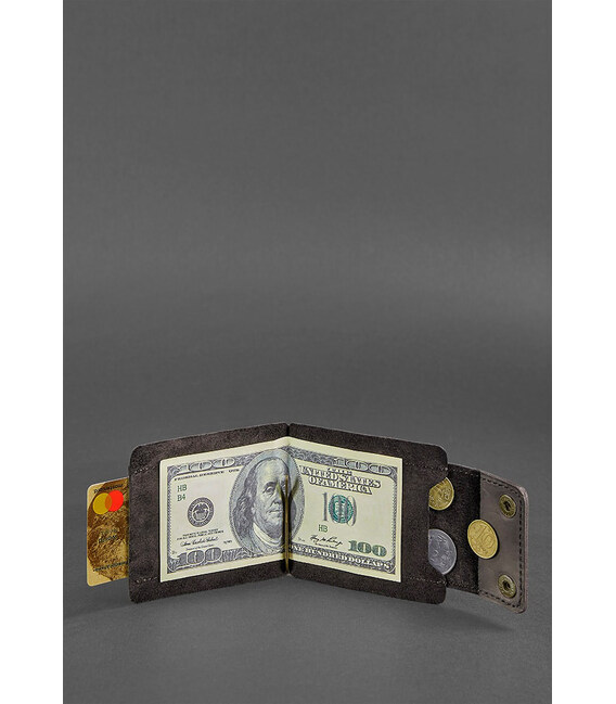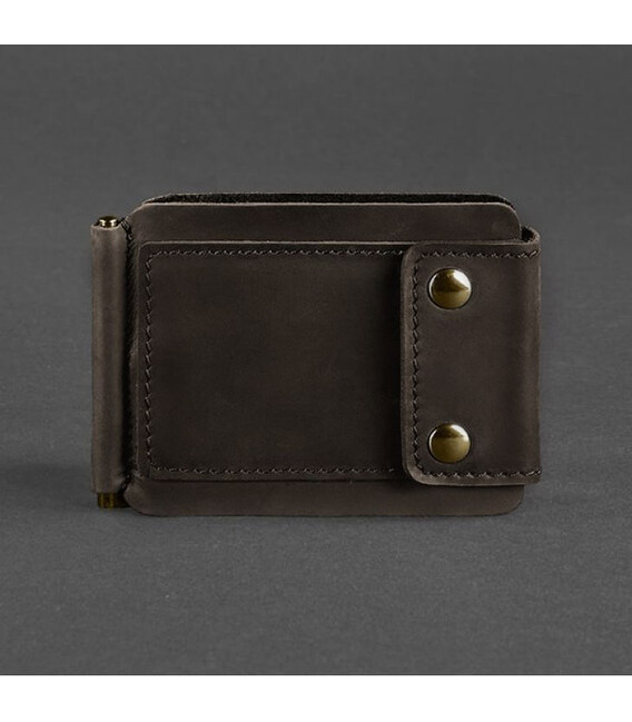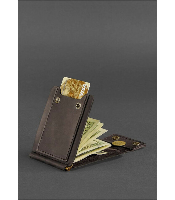 Стильное кожаное портмоне в темо-коричневой коже идеально дополнит образ современного мужчины. Внутри аксессуара имеется металлический зажим, который надежно зафиксирует купюры, а две прочные кнопки предотвратят распахивание портмоне.Также аксессуар имеет отделение для карточки и карман для мелочей.Изготовлено портмоне полностью вручную из натуральной кожи Crazy Horse. Это красивая темно-коричневая матовая кожа с легким винтажным настроением, которая выглядит очень солидно и презентабельно.Портмоне 10.0 является ярким представителем нашей коллекции «Geometry».Посмотрев вокруг себя, вы удивитесь, сколько линий и строгих форм нас окружает. Мы живём в настоящей геометрической эре. Круги, квадраты, эллипсы встречаются буквально на каждом шагу, неважно на улице вы пребываете или в помещении.И мы особым образом решили влиться в такую действительность, создав коллекцию с говорящим названием «Geometry».«Geometry» - это изделия, отличающихся предназначением, формой и цветовым решением. Среди них вы найдете бессмертную классику и необузданную феерию модерна.Только красота линий, четкость формы и стиль. Вдохновляйтесь с нами!НАСКОЛЬКО ФУНКЦИОНАЛЕН ЗАЖИМ ДЛЯ ДЕНЕГ?Стандартная вместительность зажимов для денег – 15 купюр. Учитывая существующие номиналы украинских гривен, этого вполне достаточно для хранения однодневного финансового запаса. В любом случае, дополнительным подспорьем всегда будет кредитная карта, для которой предусмотрено дополнительное отделение.КАК ПОЧИНИТЬ ЗАЖИМ ДЛЯ ДЕНЕГ Важно знать, что при активном использовании металлическая заколка может со временем ослабевать. Это обычное положение дел, которое легко исправляется. Достаточно снять заколку с кожаного чехла и подкрутить ослабевшую пружину. Всё снова будет работать, как по маслу.В целом же, качественный аксессуар способен служить десятилетиями. Главное отдавать предпочтение натуральной коже и ручной работе. Эти две составляющих обеспечат долгий срок службы изделию.Гарантия на портмоне – 3 года с момента покупки!ВНИМАНИЕ! Выделка данной кожи предполагает естественное появление на ней царапин и потертостей в ходе использования! От этого изделие становится более индивидуальным и приятным, это оценят настоящие поклонники винтажного стиля:) А так же первое время кожа может краситься при сильном трении об другие предметы - это особенность её выделки, постепенно этот эффект уменьшается, кожа полируется и приобретает чуть глянцевый эффект.Фурнитура и комплектация может быть изменена производителем