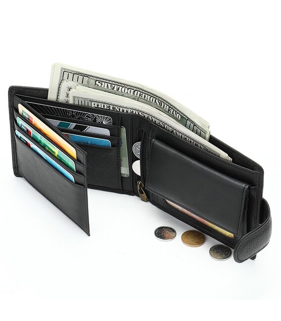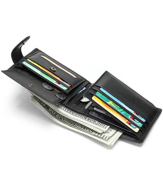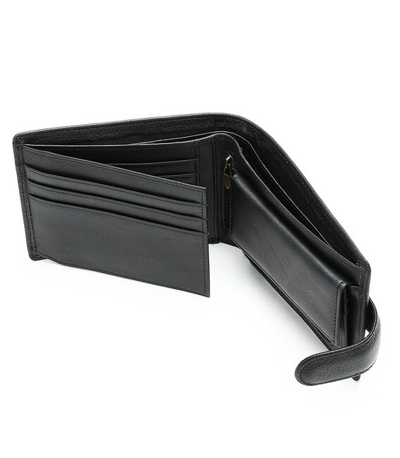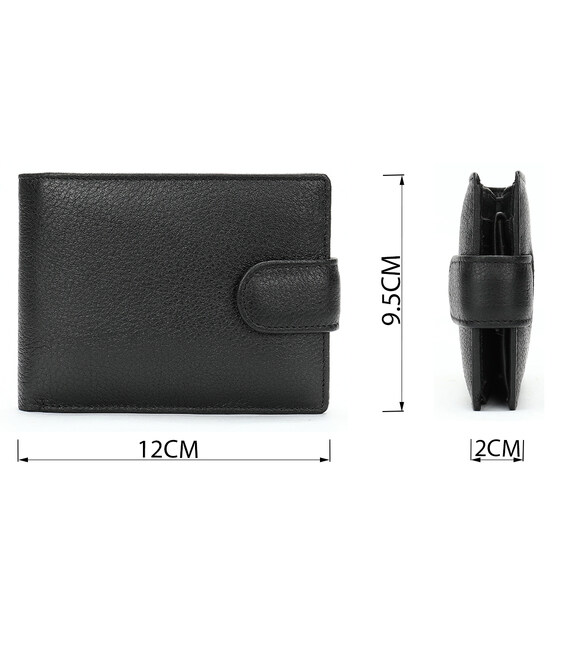 Простой и классический бумажник. Портмоне закрывается на кожаный хлястик с кнопкой. Модель имеет минимальный размер и легко поместится в карман брюк. Аксессуар упакован в тканевый пылезащитный чехол. Кошелек будет прекрасным и незаменимым подарком для любого мужчины.