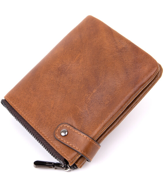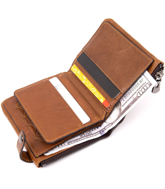 Тонкое компактное портомне из натуральной кожи с хлястиком на кнопке, закрывается портмоне сверху. Изделие имеет большой карман на молнии для купюр. Внутри достаточно ячеек для кредиток. Изделие продумано для современного человека. Который отдает предпочтение карточкам и носит минимум налички. Изделие имеет насыщенный рыжий цвет. Оригинальный аксессуар выгодно выделит вас из толпы. Кошелек станет прекрасным подарком для ваших близких.