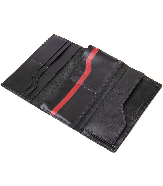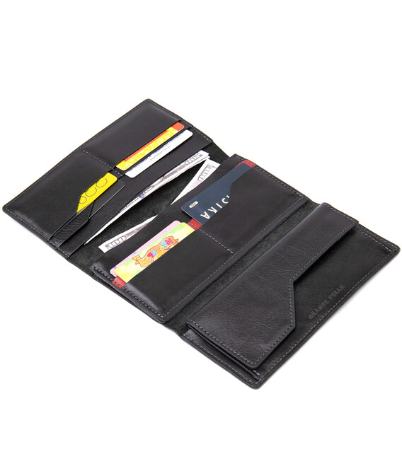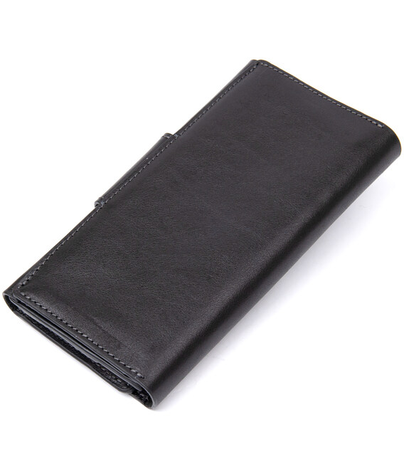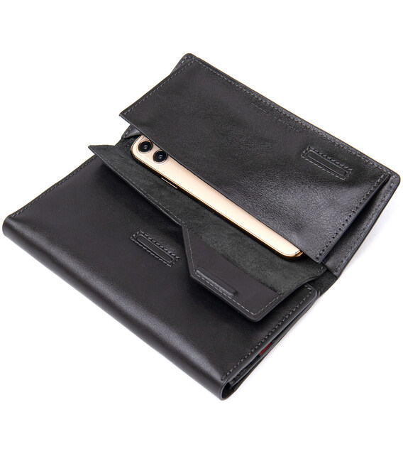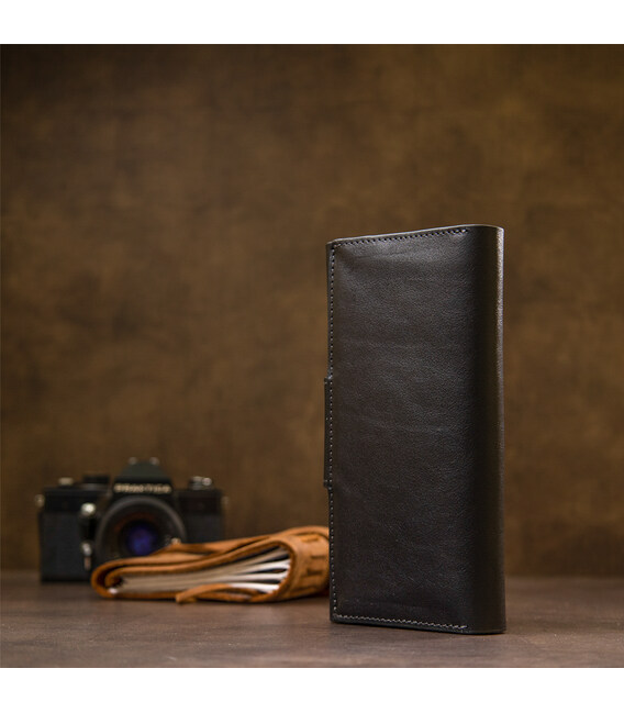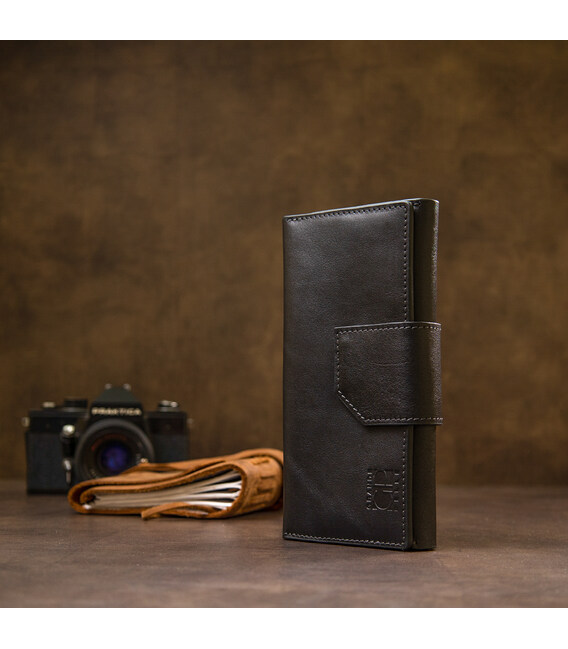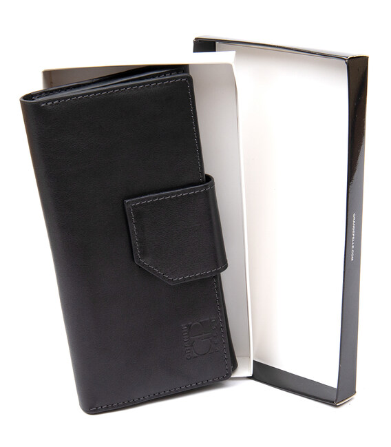 Многофункциональное портмоне на хлястике с магнитом. Имеет внутри вместительные и практичные отделения для купюр, большую монетницу на магните и восемь слотов для различных карт и визиток. Материал изготовления – натуральная мягкая на ощупь кожа. Цвет изделия черный, что делает бумажник практически универсальным. Упаковка – фирменная картонная коробка.