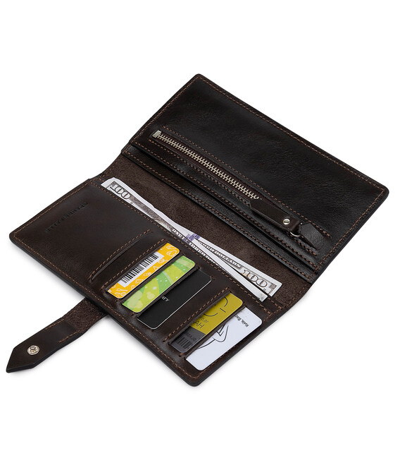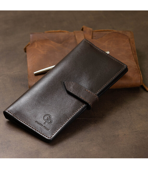 Практичное и вместительное мужское портмоне из натуральной износоустойчивой кожи от украинского производителя. Выполнено в красивом шоколадном цвете в гладкой глянцевой фактуре. Имеет просторные отделения для купюр, удобную монетницу на молнии и карманы для пластиковых карт или визиток. Упакован аксессуар в картонную коробку с фирменным логотипом.