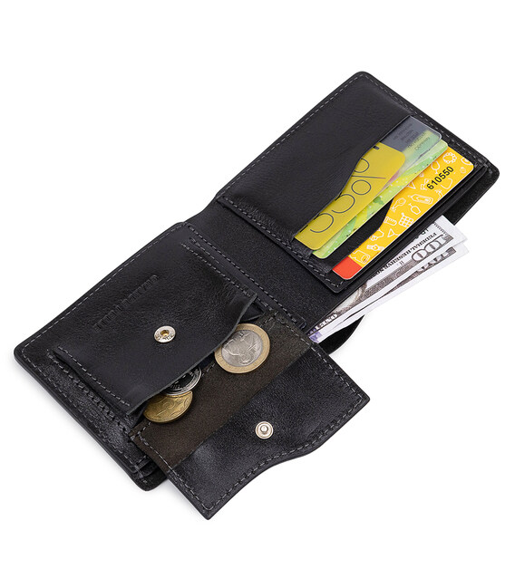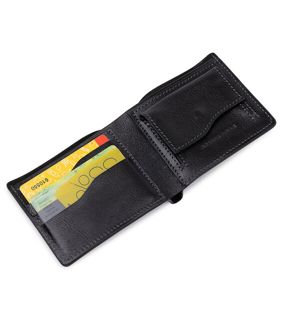 Классическое мужское портмоне небольшого размера в глянцевой гладкой фактуре. Материал изготовления – натуральная износоустойчивая кожа высокого качества. Внутри есть отделение для купюр, слоты для пластиковых карт и визиток, а также монетница на кнопке. Упаковано изделие в фирменный уплотненный чехол.