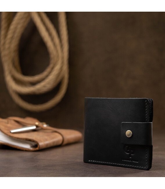 Небольшое мужское портмоне высокого качества исполнения и материалов. Легко помещается в сумке любого размера или в кармане. Закрывается изделие на удобный хлястик с кнопкой. Внутри есть вместительное отделение для купюр, два слота для карт и монетница на кнопке. Упаковано изделие в фирменный чехол.
