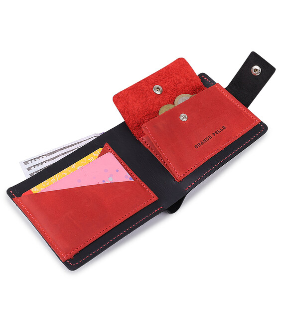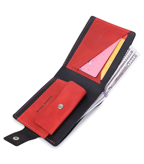 Симпатичное портмоне из натуральной кожи высокого качества исполнения. Имеет вместительное отделение для купюр, два слота для пластиковых карт и компактную монетницу на кнопке. Выполнено изделие в черном цвете с сочетанием красного, что смотрится очень стильно и современно.