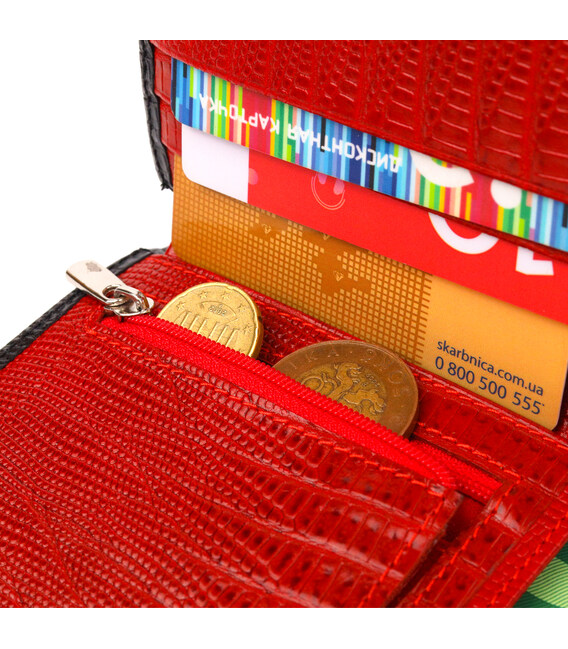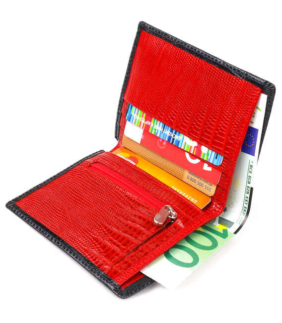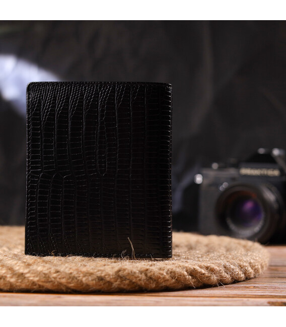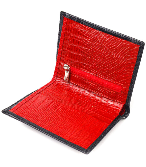 Комбинированное мужское портмоне, из натуральной фактурной кожи, с тиснением под рептилию, в классическом черном цвете снаружи и красном цвете - внутри. Аксессуар имеет одно основное отделение, с перегородкой, в которое помещаются купюры всех номиналов, три отсека для карточек, монетницу на молнии с расширителем, два прилегающих кармана. На внешней стороне, металлический логотип производителя. Цвет фурнитуры – серебро. Кожаный кошелек является действительно нужными практичным подарком.