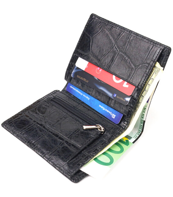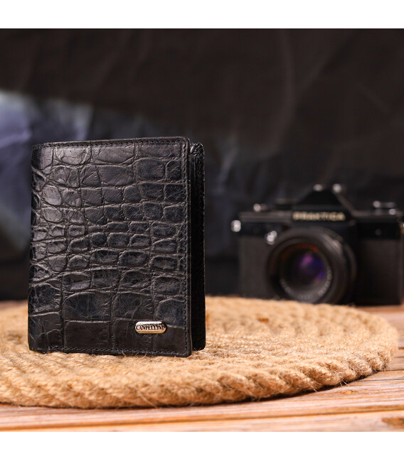 Достойное Вашего внимания мужское портмоне, из натуральной фактурной кожи, с тиснением под крокодила. Аксессуар имеет одно основное отделение, с перегородкой, в которое помещаются купюры всех номиналов, три отсека для карточек, монетницу на молнии с расширителем, два прилегающих кармана. На внешней стороне, металлический логотип производителя. Цвет фурнитуры – серебро. Кожаный кошелек является действительно нужными практичным подарком.
