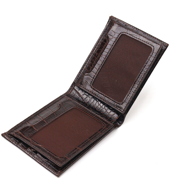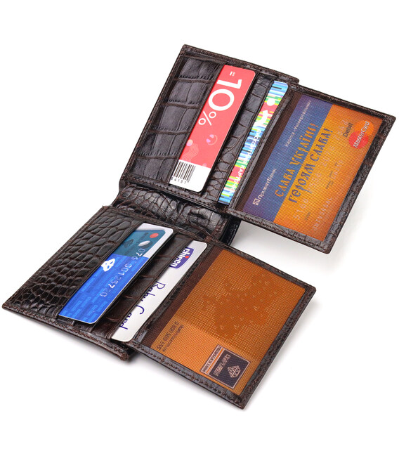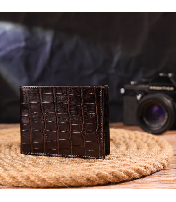 Компактный мужской бумажник, из натуральной фактурной кожи, с тиснением под крокодила. Аксессуар имеет одно основное отделение с перегородкой, в которое помещаются купюры всех номиналов, двенадцать карманов для карточек, четыре из которых под сеточкой. Вы легко сможете поместить его в карман брюк или маленькую сумку. Упакован бумажник картонную коробку. Кожаный кошелек является отменным подарком для родных и близких людей.