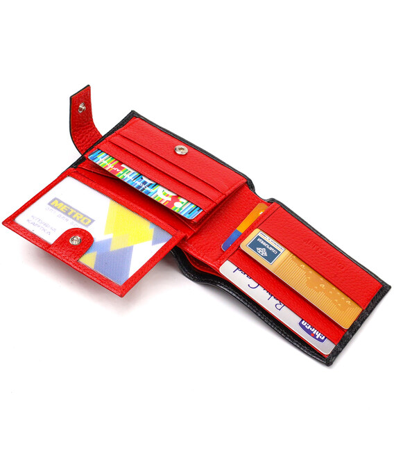 Интересный мужской кошелек, из натуральной кожи, в комбинации двух цветов черного снаружи, красного внутри. Аксессуар имеет одно основное отделение с перегородкой, в которое помещаются купюры всех номиналов, девять карманов для карточек, два из которых под сеточкой, монетница и два прилегающих кармана. Закрывается аксессуар хлястиком на кнопку. Цвет фурнитуры – серебро. Вы легко сможете поместить его в карман брюк или маленькую сумку. Упакован бумажник картонную коробку. Кожаный кошелек является отменным подарком для родных и близких людей.