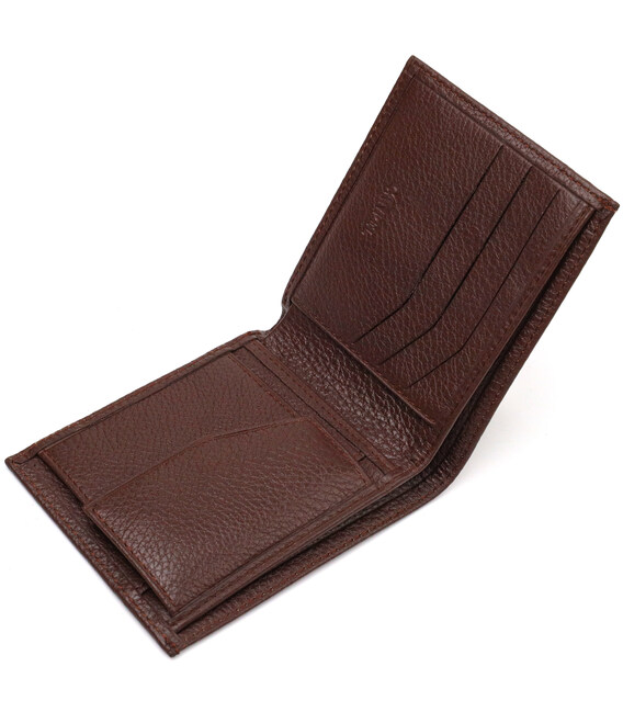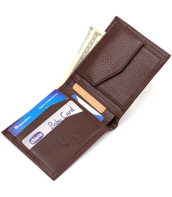 Стильный мужской кошелек из натуральной зернистой кожи. Аксессуар имеет одно основное отделение с тканевой перегородкой в которое помещаются купюры всех номиналов, три кармана для карточек, два прилегающих кармана и монетницу. Закрывается аксессуар пополам, без застежки. На лицевой стороне, в правом нижнем углу металлический логотип компании производителя. Приобретая кожаный аксессуар этой фирмы, себе или на подарок, будьте уверены, что он прослужит Вам не один год.
