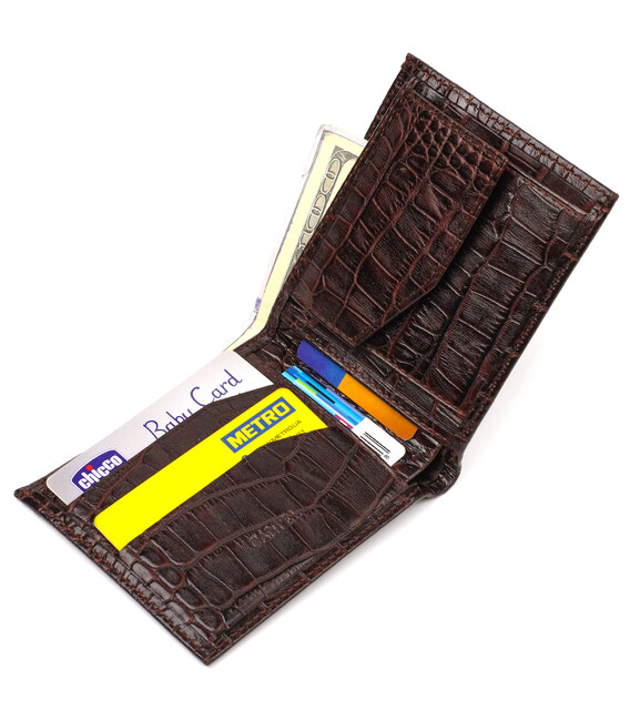 Великолепный мужской кошелек из натуральной кожи, с тиснением под крокодила. Аксессуар имеет одно основное отделение с тканевой перегородкой в которое помещаются купюры всех номиналов, три кармана для карточек, два прилегающих кармана и монетницу. Закрывается аксессуар пополам, без застежки. На лицевой стороне, в правом нижнем углу металлический логотип компании производителя. Приобретая кожаный аксессуар этой фирмы, себе или на подарок, будьте уверены, что он прослужит Вам не один год.