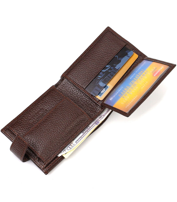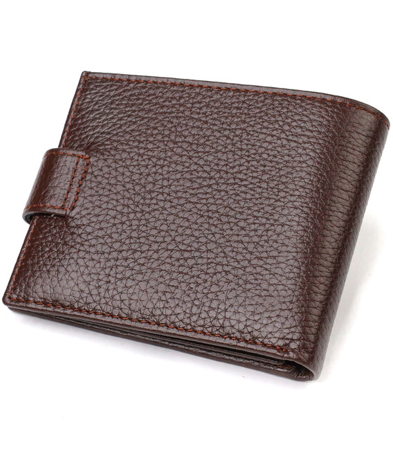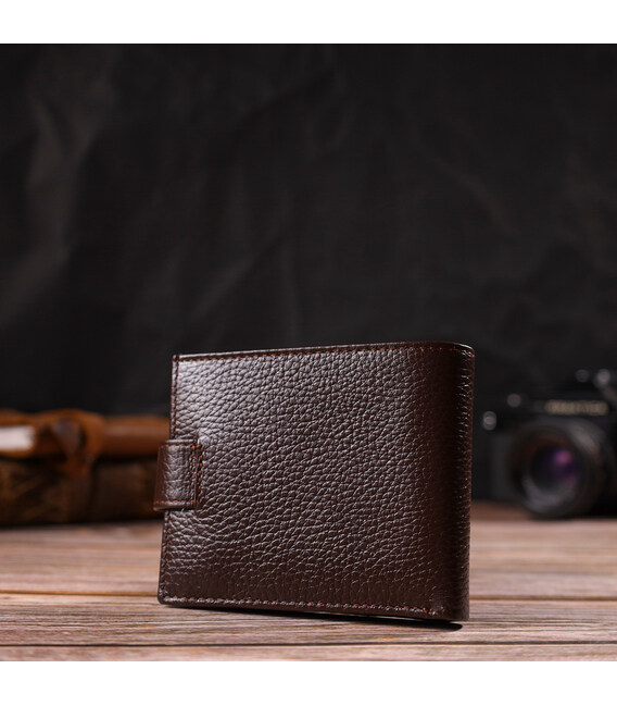 Мужское портмоне небольшого размера из натуральной зернистой кожи. Аксессуар имеет основное отделение для купюр с перегородкой, три ячейки для карточек, два карманы под сеточкой, два прилегающих кармана и монетницу. Кошелек складывается пополам, закрывается хлястиком на кнопку. На лицевой стороне в правом нижнем углу, расположен металлический логотип компании производителя. Многофункциональный мужской бумажник из очень прочной кожи отличный выбор подарка для солидного мужчины.