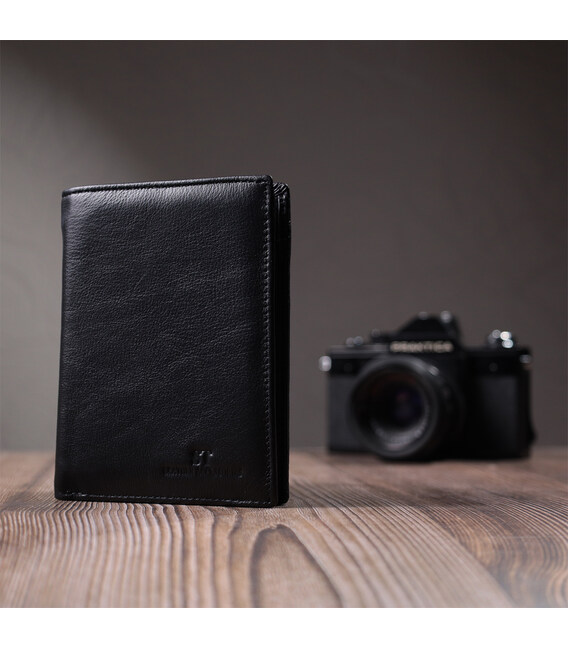Изделие выполнено из натуральной кожи черного цвета. Материал приятно ощущается в руке, выглядит солидно и хорошо подходит для ежедневного использования. Вертикальный формат делает модель удобной для ношения в сумке, барсетке или внутреннем кармане.